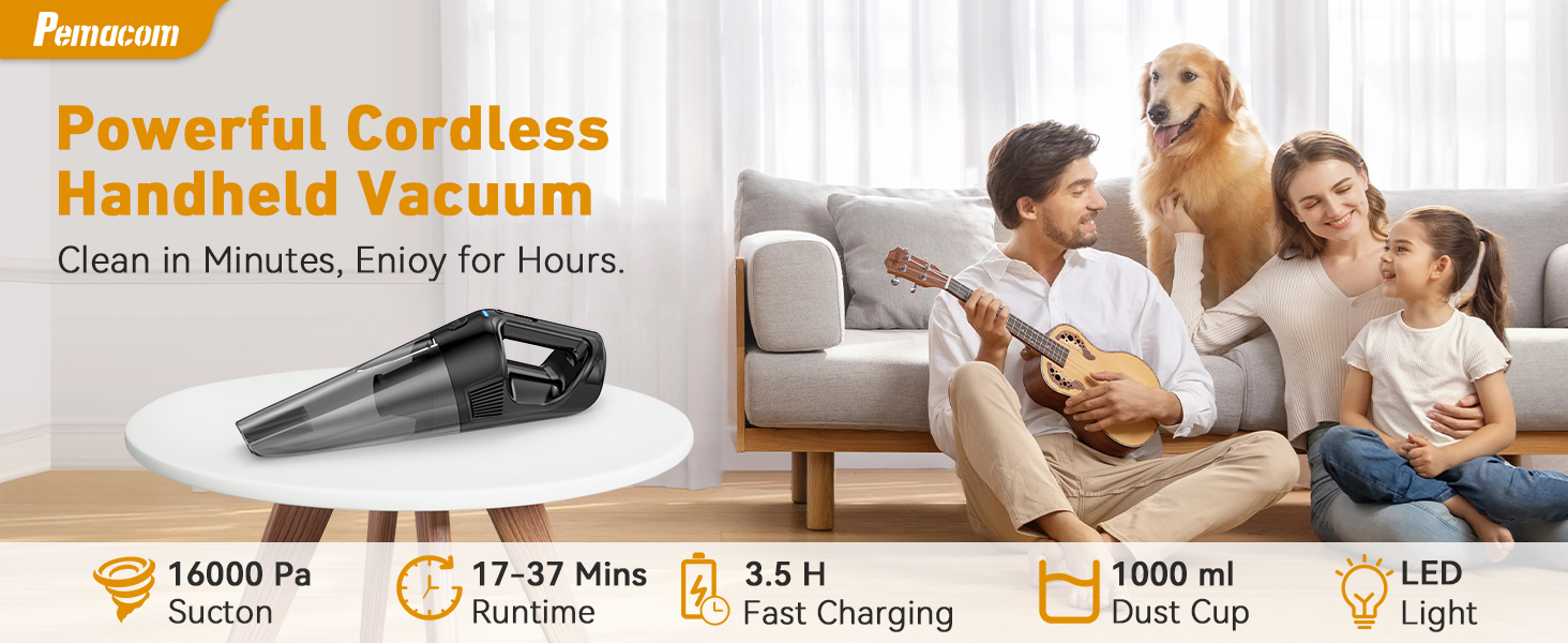 Powerful Suction & Brushless Efficiency: The handheld vacuum cordless driven by a high-efficiency brushless motor, 16000Pa powerful suction enables a 15-minute fast cleanup covering up to 120㎡, engineered to instantly pick up floor debris, dust, hair, bread crumbs, potato chip crumbs, rice grains, cereal, coffee grounds, sugar, long hair, pet hair, cat litter and pet food. The brushless motor delivers consistent airflow that lifts embedded mess from hard floors, sofa crevices, bed edges and drawer tracks, achieving visible pickup efficiency with fewer passes and no performance drop during use