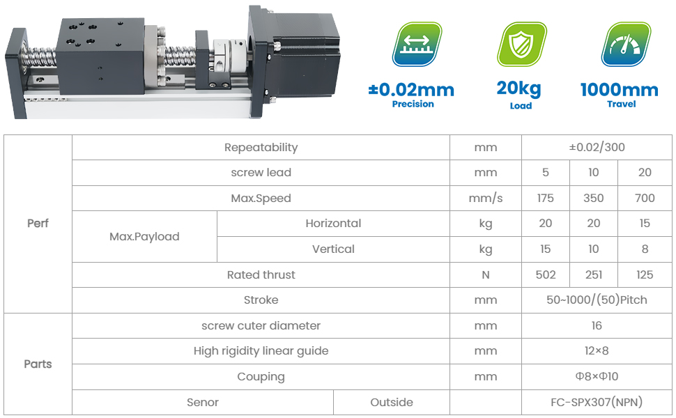 ±0.02mm High Precision: Delivers ±0.02mm repeatable positioning accuracy, ideal for industrial automation, CNC machining, 3D printing, and robotic positioning projects requiring precise linear motion.