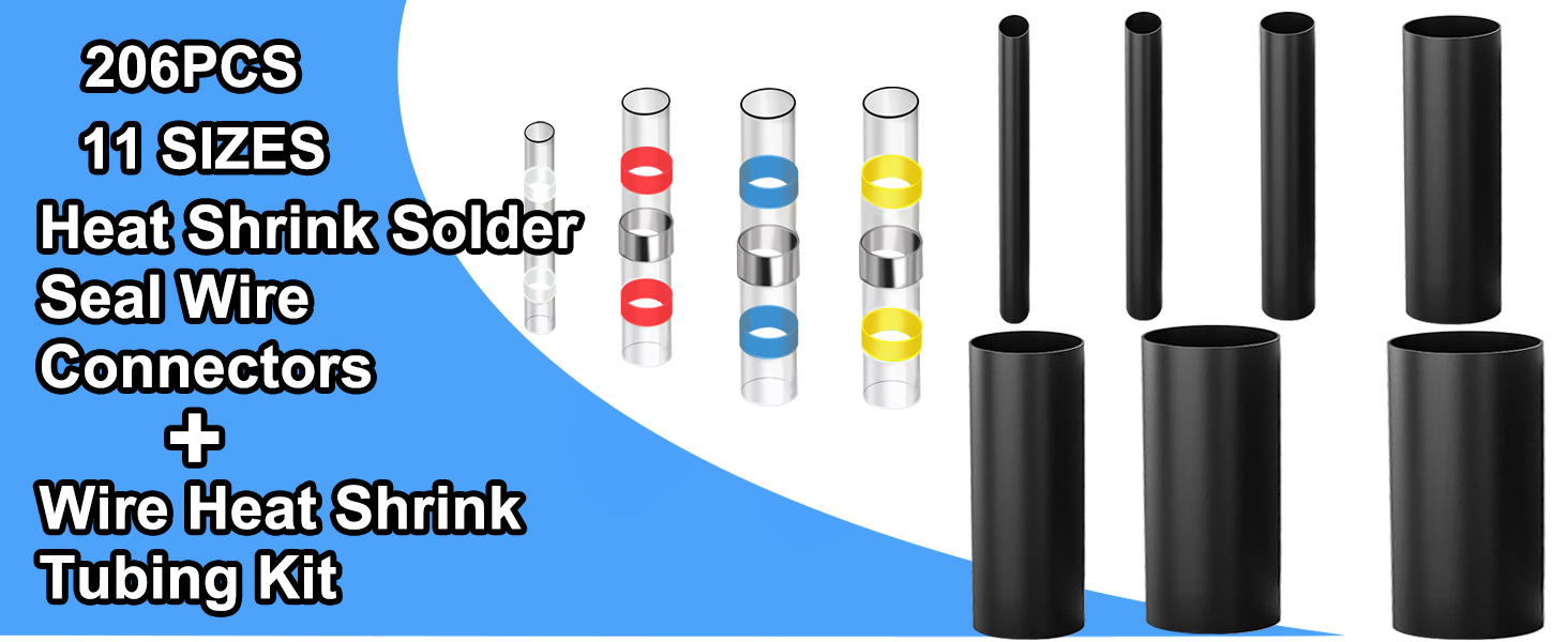 Heat Shrink Solder Seal Wire Connectors Kit: Includes 120 solder seal connectors (30 white/AWG26-24, 40 red/AWG22-18, 40 blue/AWG16-14, 10 yellow/AWG12-10) + 86 black 3:1 heat shrink tubes (30×3/32", 25×1/8", 12×3/16", 8×1/4", 5x3/8", 4×1/2", 2×3/4").