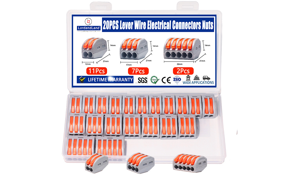 Specification : This LordandLand lever wire connectors kit includes 11 pieces of 1-in-1-out, 7 pieces of 1-in-2-out, and 2 pieces of 1-in-5-out, totaling 20 connectors, designed to meet the needs of various circuit types. Featuring quick-disconnect functionality and reusability, it offers an economical and convenient wiring solution.