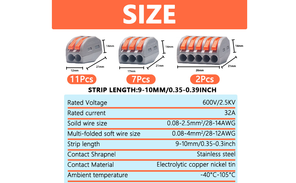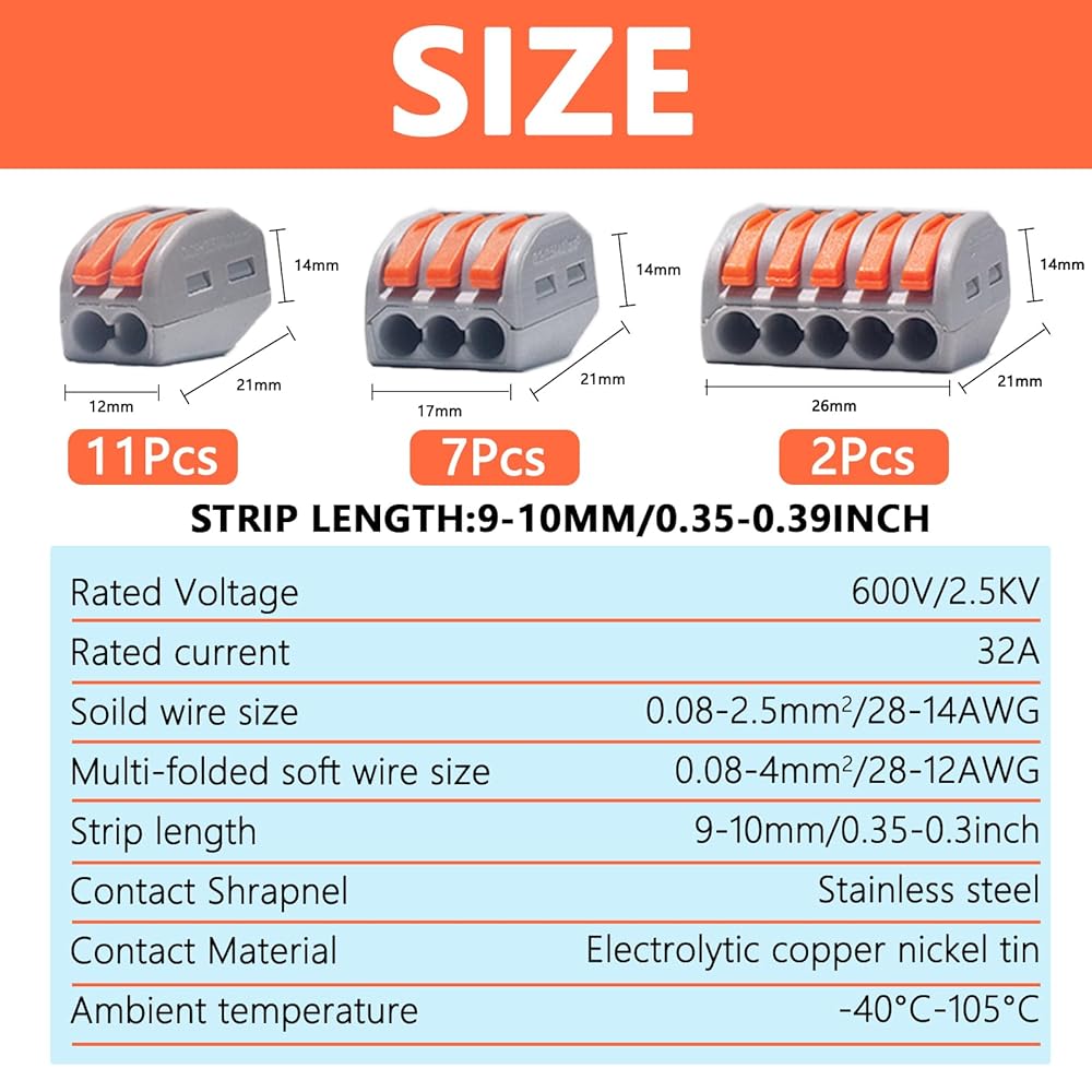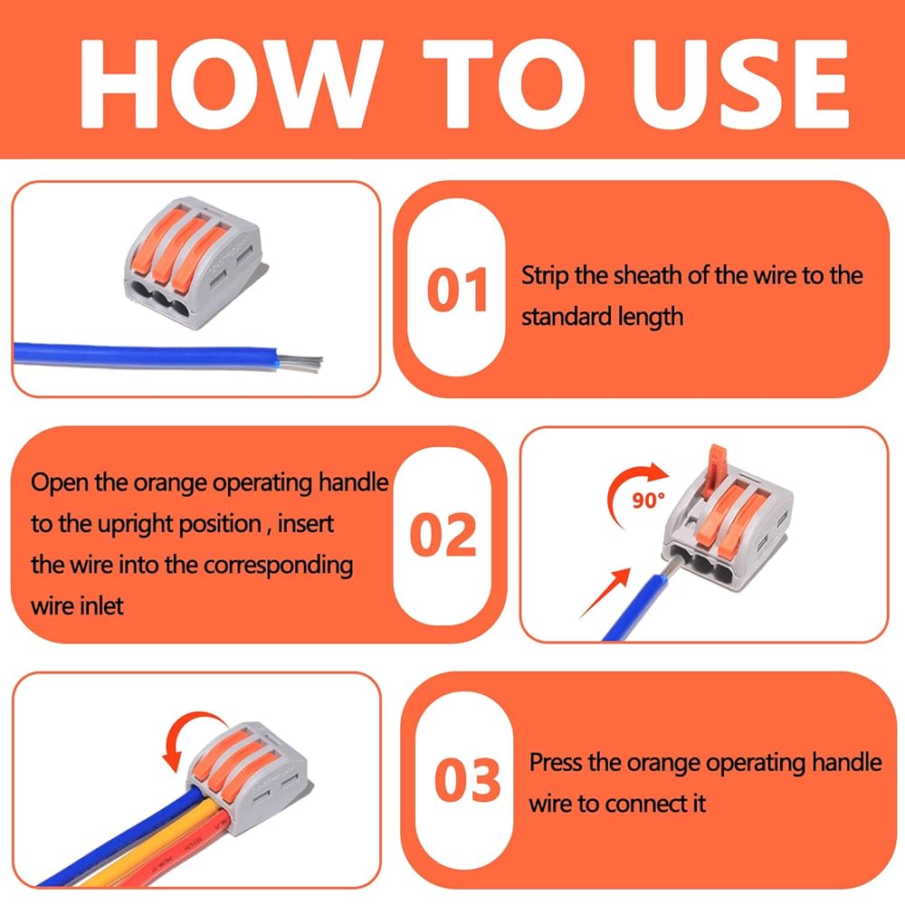 Convenience : You can connect wires without any tools with your hands. Push the orange handle to 90° and plug in the wire (peel the wire case to 0.35-0.47 inches and make sure the wire is inserted into the end. Do not open the wire case for too long) and place the back of the wire clip. When you make an electrical connection, you only need a little power to push the lever up.