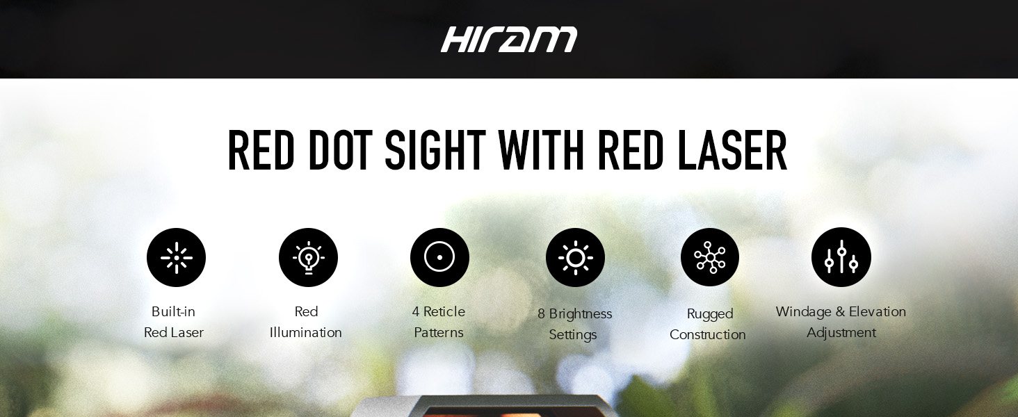 Clear Precision Reflex Sight: Hiram's reflex sight with green laser offers clear and crisp aiming through its 28x40 mm fully multicoated lens, supported by a 2 MOA red dot reticle with 4 patterns and 8 brightness levels, ensuring precision in diverse lighting conditions