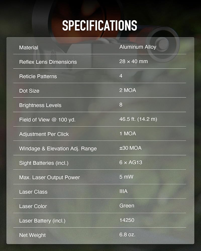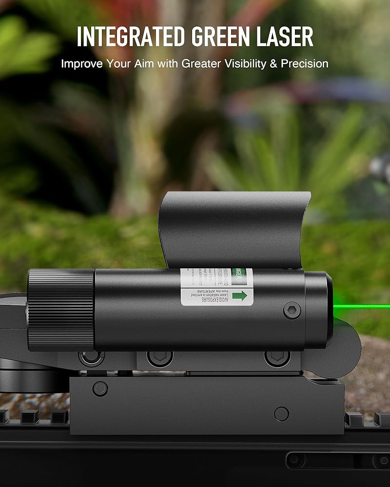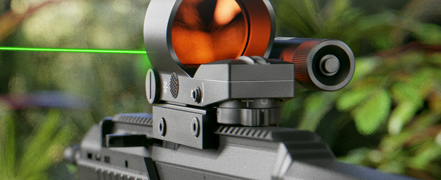Pinpoint Accuracy: With its wide field of view and unlimited eye relief, this red dot sight enables effortless and accurate target acquisition, further enhanced by its integrated Class IIIA green laser for quick and precise aiming, even in low-light scenarios