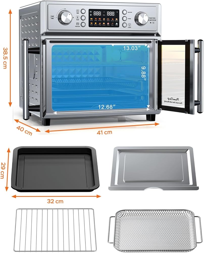 1. Large Capacity & Multi-FunctionThis oven features a roomy 26QT (16.9”×16.1”×13.78”) capacity, making it ideal for family meals and gatherings. As a 7-in-1 multi-functional appliance, it can toast up to 6 slices of bread at once—your top choice for versatile cooking. It supports a variety of cooking methods, including baking, roasting, grilling, toasting, dehydrating, and defrosting, fully meeting all your daily cooking needs.