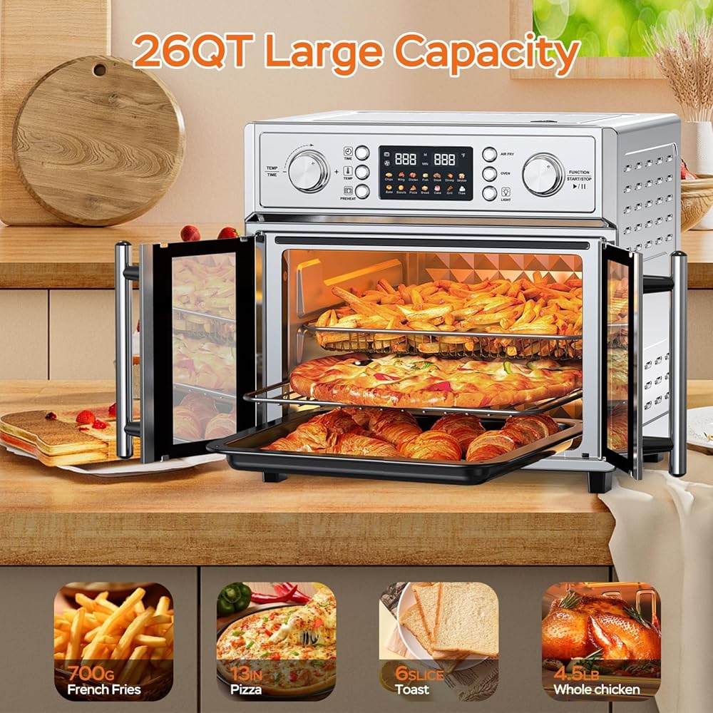 Large Capacity French Double-Door Air Fryer Convection Toaster Oven, 1700W, 14 Preset Menus, 7-in-1 Multi-Function (Bake, Roast, Gril,Toast,Dehydrate&Defrost), Stainless Steel,silvery China Silver