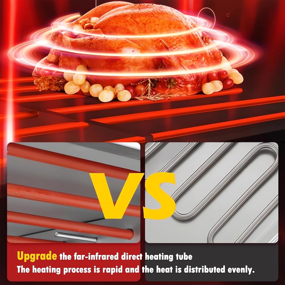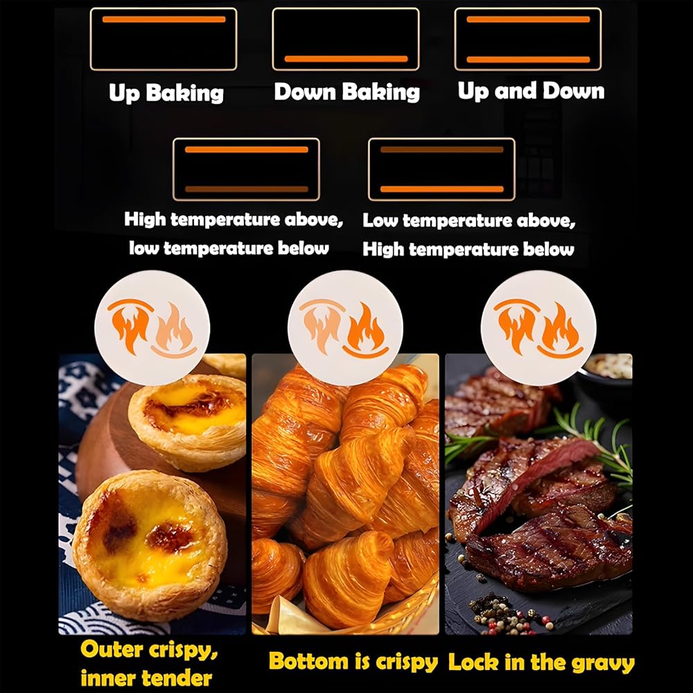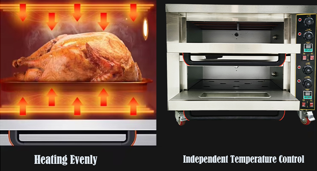Independently Controlled Temperature. The control panel integrates four humanized functions of temperature regulation, timing, lighting and buzzer alarm. Red light can determine whether the oven is in working condition; The upper and lower heating tubes of each layer can be independently controlled. Timing function is efficient and worry free; The buzzer alarm can alert you as soon as possible.
