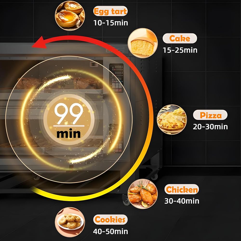 0-99min Timing Range. There are 6 thick high-quality heating tubes above and below each layer of the oven, and the heating tube has high density, which can be heated quickly and quickly, improve the baking efficiency and ensure the baking effect.