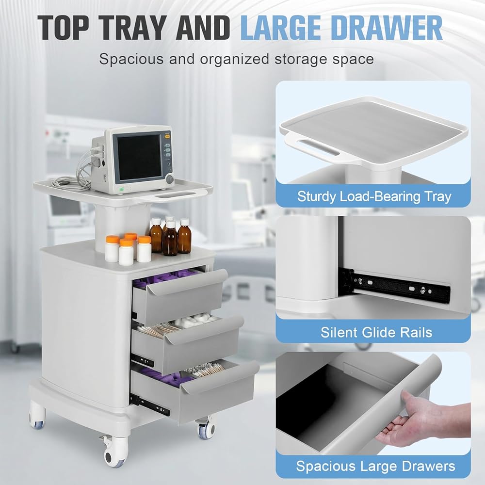 Load-bearing Tray and Large Drawers Enhance Laboratory Storage Efficiency: The top load-bearing tray on the medical cart can hold monitors, tablets, and other equipment. Three large-capacity drawers with silent slides allow for smooth and unobstructed access to reagents and tools in laboratories and medical aesthetic salons.