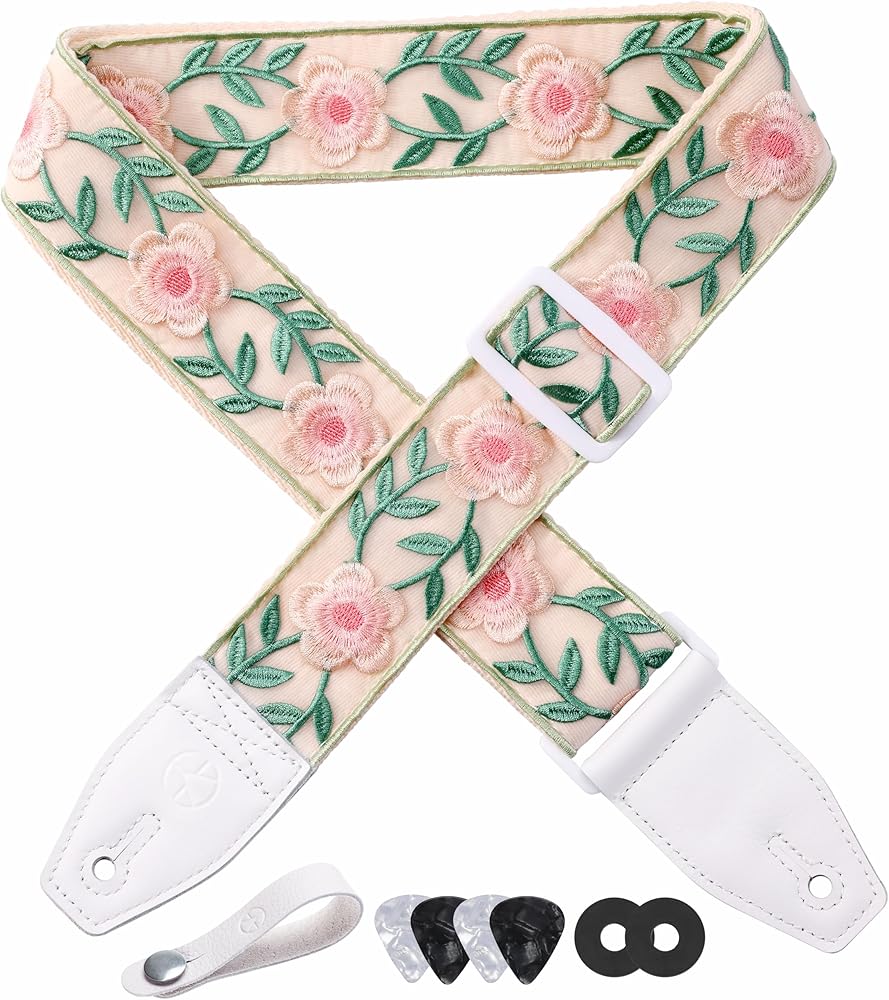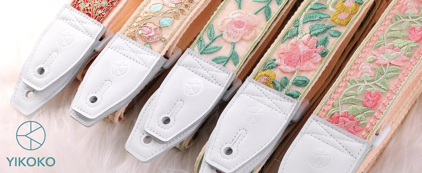 【Special Design】-YIKOKO Guitar Strap features exquisite craftsmanship with exquisite embroidered flowers and white leather ends, both ornamental and functional. Available in multiple colors to suit the individual preferences of all age groups.