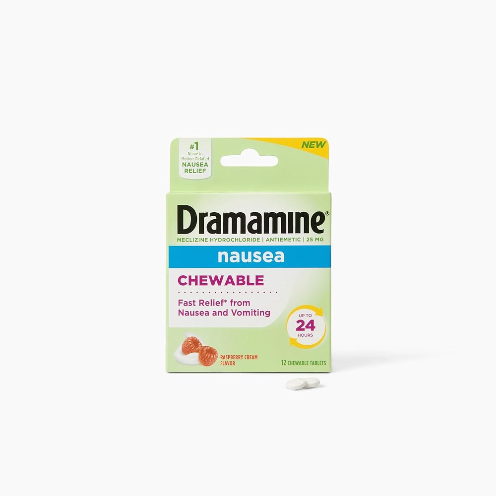 Dramamine Nausea Chewable provides fast relief* from nausea and vomiting. These raspberry cream chewables deliver nausea relief for up to 24 hours. Dye-free and convenient, they are an essential travel item for road trips, flights, and cruises. Suitable for adults and children ages 12 and up. For correct dosage, follow the directions on the package. Dramamine is the #1 brand in motion-related nausea relief (based on IRI data collected 7/14/24–7/13/25). For correct dosing, follow the directions on the package. Individual results may vary. *Fast relief refers to typical onset of relief within 30 minutes. Individual results may vary.