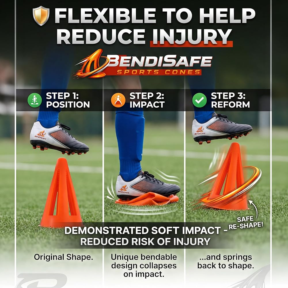 🛡️ FLEXIBLE TRAINING CONES THAT REDUCE INJURY RISK Soft flexible design bends on impact and springs back to shape. Ideal for youth sports, PE classes, agility drills, and fast-moving training environments.