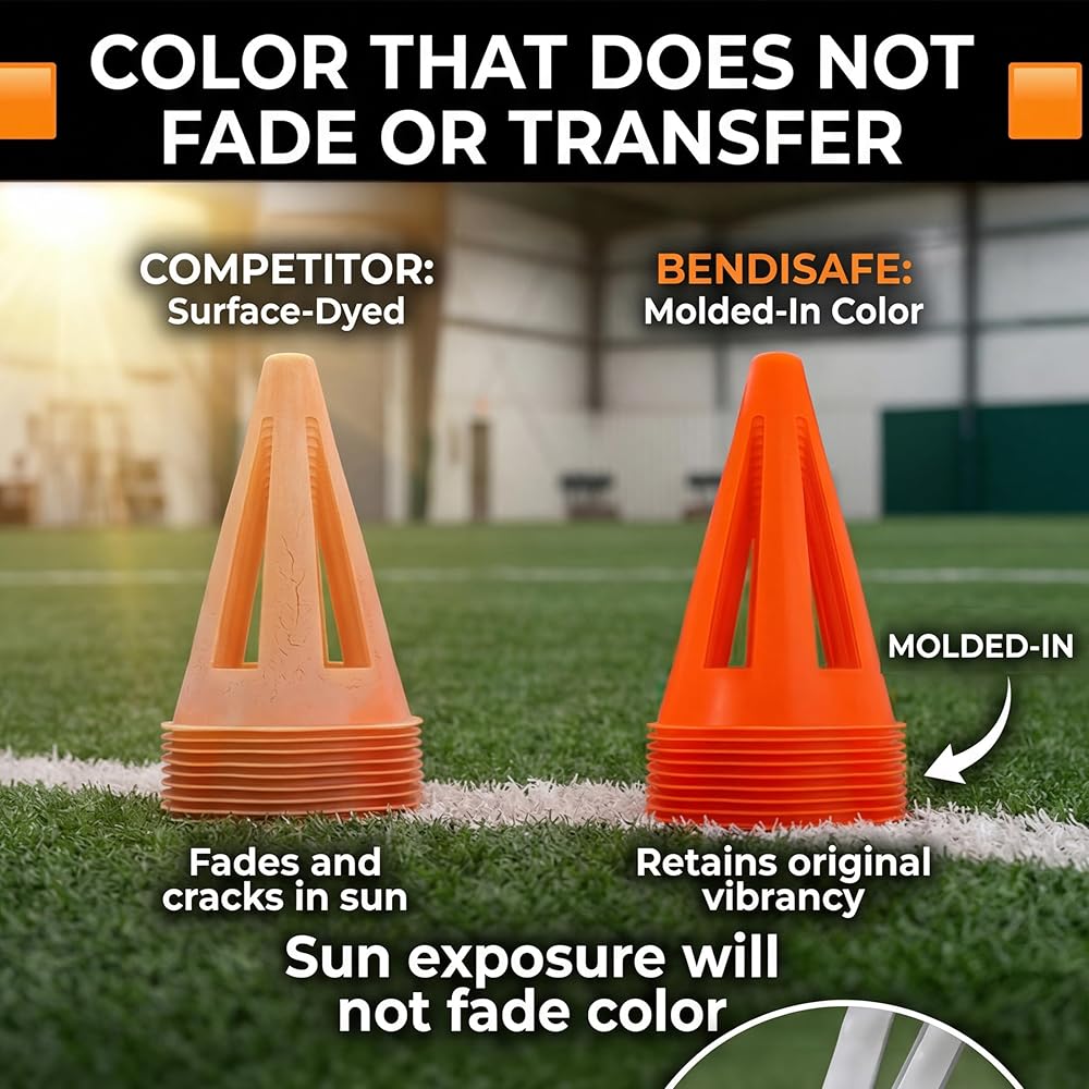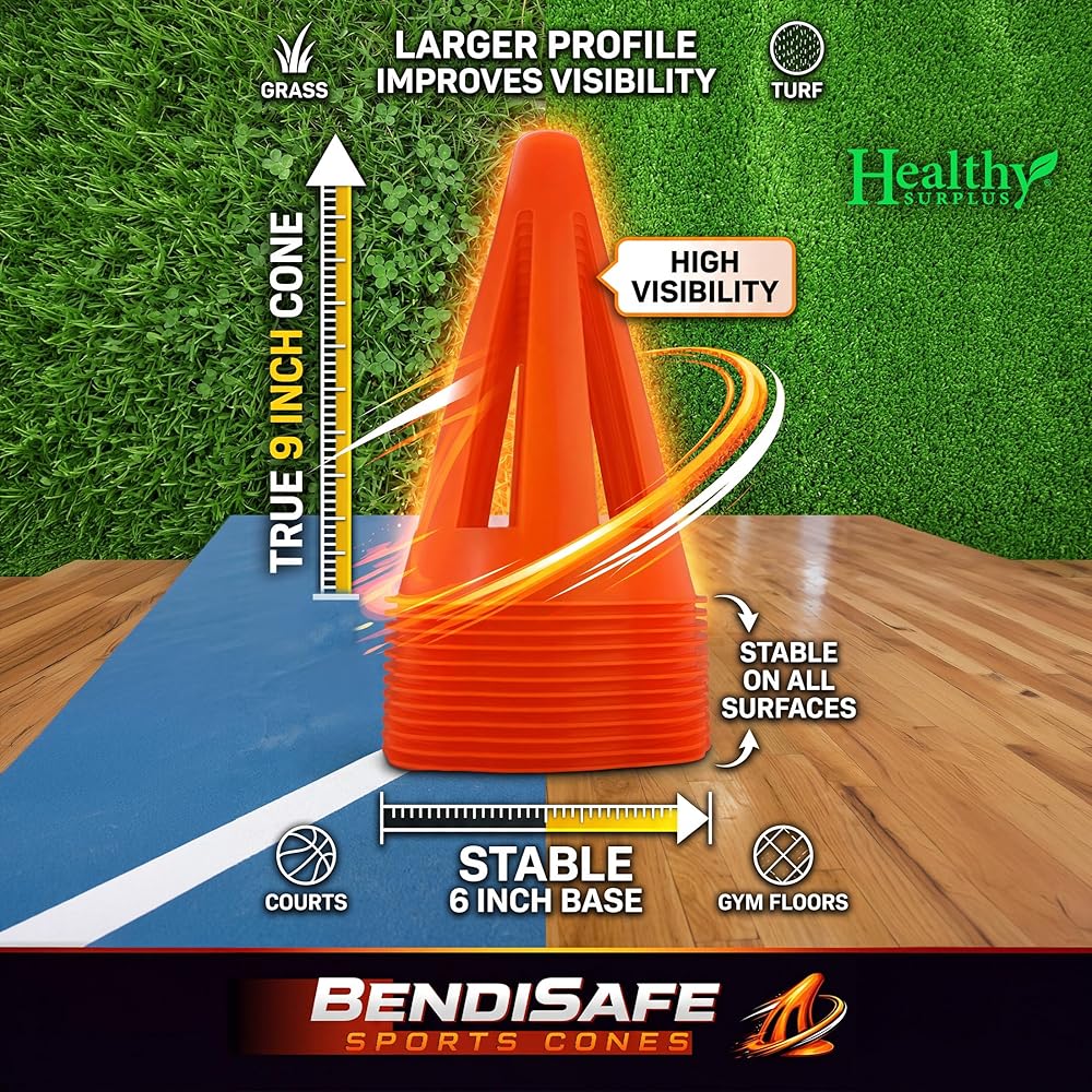 📏 TRUE 9 INCH CONE WITH STABLE 6 INCH BASE Larger profile improves visibility while the wide base provides stability on grass, turf, courts, and gym floors. Great for soccer practice, football training, basketball drills, and field marking.