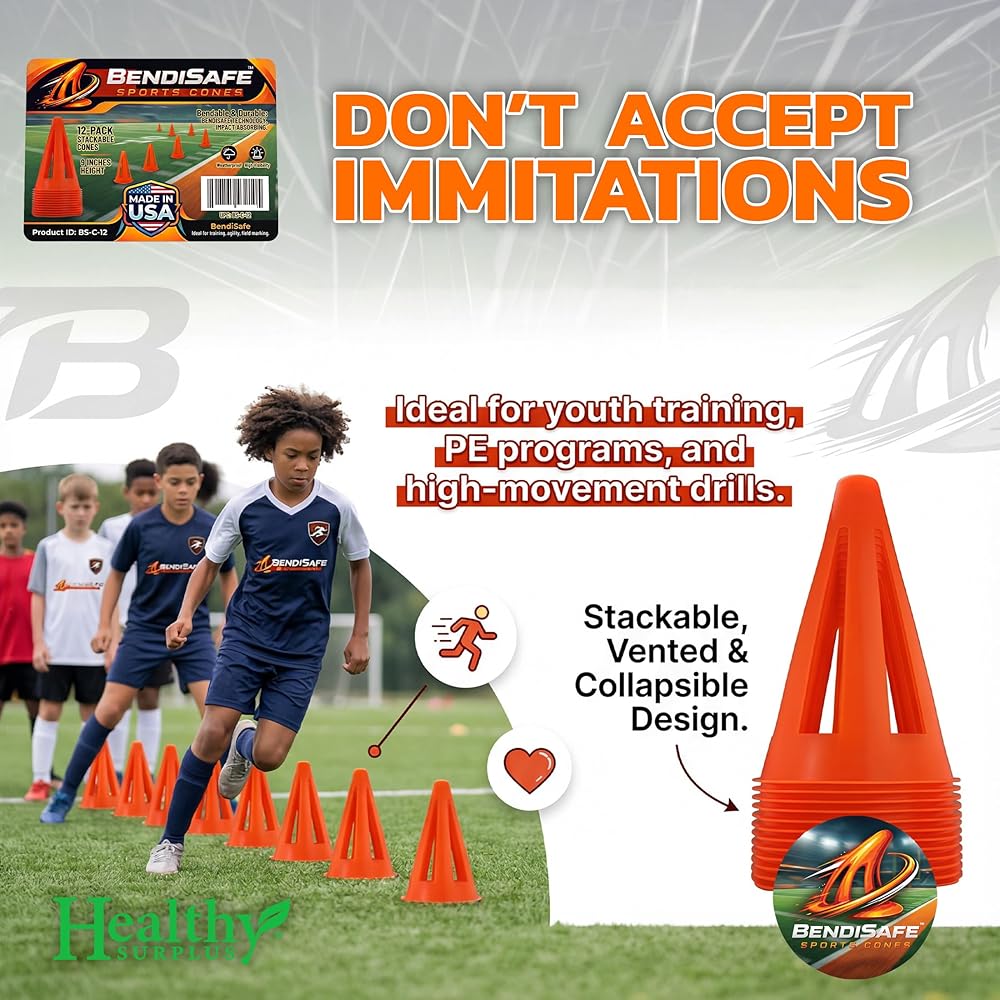 These flexible soccer training cones are designed for coaches, athletes, and trainers who need reliable field markers for drills and conditioning. Each cone stands 9 inches tall with a stable 6-inch base, making them easy to see while remaining stable during fast-paced training. The flexible material bends on impact and springs back to shape, helping reduce injury risk during high-movement drills. Perfect for a wide variety of sports including: soccer training drills football agility drills basketball practice PE class activities speed and conditioning workouts obstacle courses and field marking Bright high-visibility orange cones ensure players can quickly identify drill positions on grass, turf, gym floors, or playground surfaces. Manufactured in the United States, these cones deliver dependable performance for schools, teams, coaches, and training programs. Includes 12 flexible sports training cones.