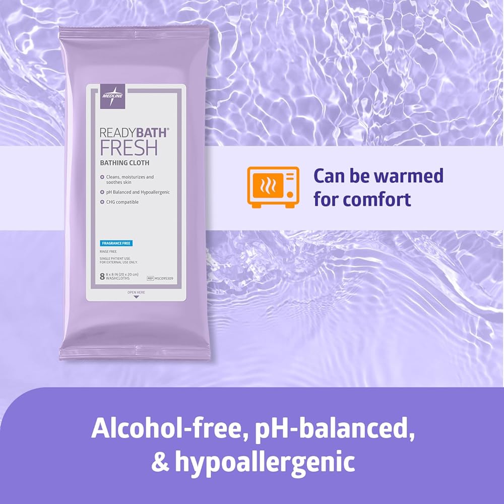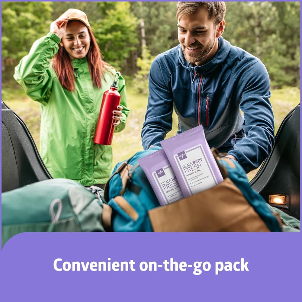 ReadyBath Fresh bathing wipes are perfect for adults looking to freshen up by being soft on skin and soothing, formulated with aloe vera and pH-balanced ingredients. These extra durable cleansing body wipes are premoistened with this rinse free formula in packs to give you a full shower per one pack. Our protective packs are travel sized and keep wipes moist and fresh, so you can enjoy ReadyBath Fresh on-the-go with ease. Great for those who are bedridden, when a shower is not possible, and everyday cleansing, our wipes are a must-have for at home or on-the-go. Enjoy a deep all over clean. This product is a wipe pack of 8 unscented lightweight wipes in each pack. Wipes can be warmed for comfort. Be sure not to overheat. These adult bath wipes are safe for everyday use, and great for women and men, or elderly when it comes to bathing or showering. Store out of reach of children.
