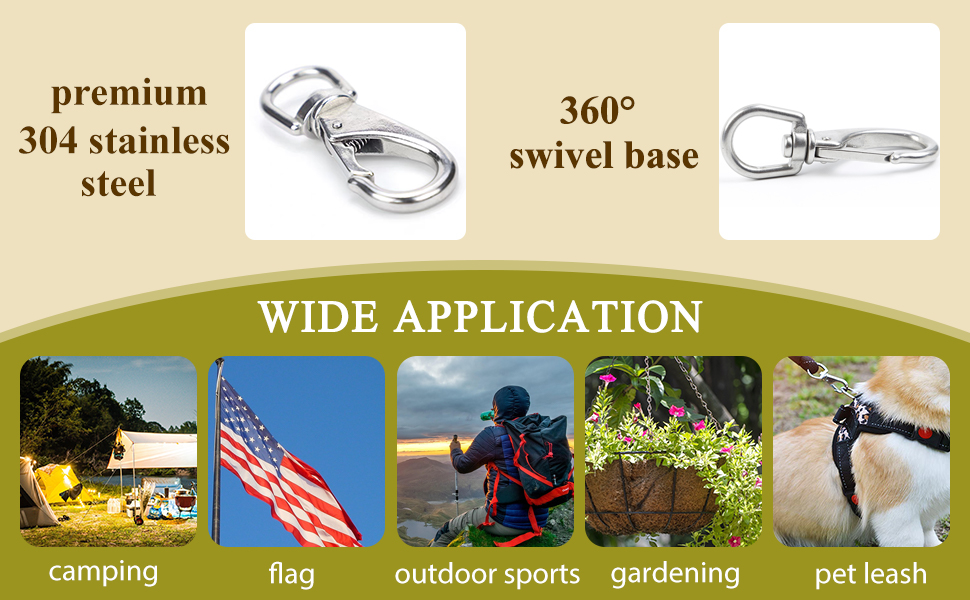 • Superior Material Construction : Made of premium 304 stainless steel, this swivel snap hook fights rust, corrosion, and daily wear—suitable for outdoor (camping, boating) and humid indoor (bathroom, kitchen) use. It holds up to 154lbs without bending, ensuring reliable performance for years