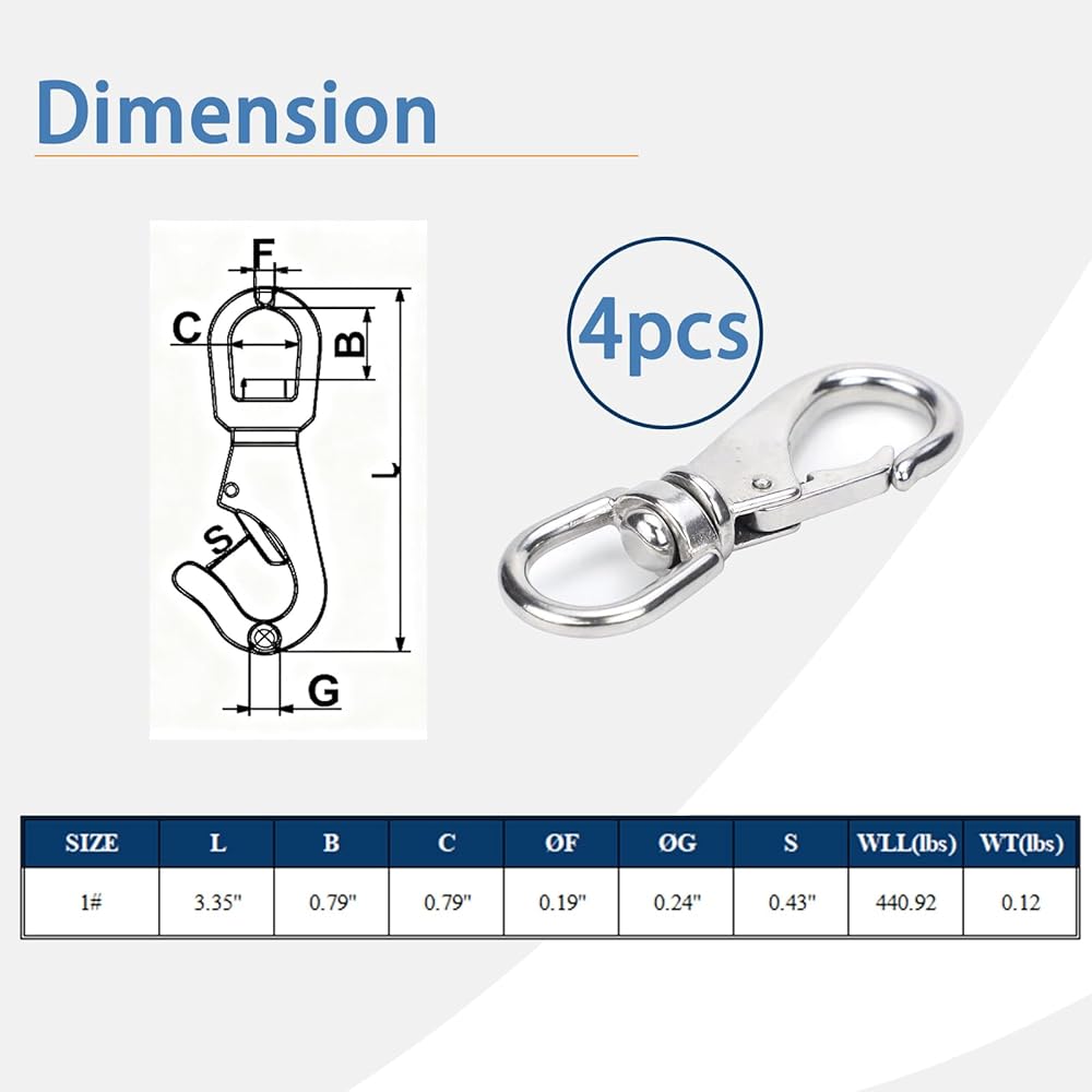 • Product Specification : Our product package includes 4pcs of 1#3.5" Swivel Snap Hooks, The net weight of each Swivel Eye Snap Clip is 63g (about 2.22 ounces), max capacity 154 lbs