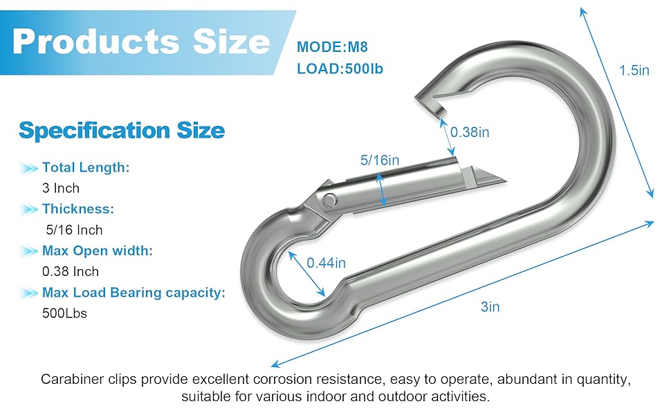 2.4 Inch Spring Snap Hook: Heavy duty snap hooks with 2-3/8" wire diameter, max loading up to 260lb. 0.31" max opening, allowing fastest connection/disconnection usages. Total length 3inch, suitable for Outdoor activities, indoor and outdoor equipment.