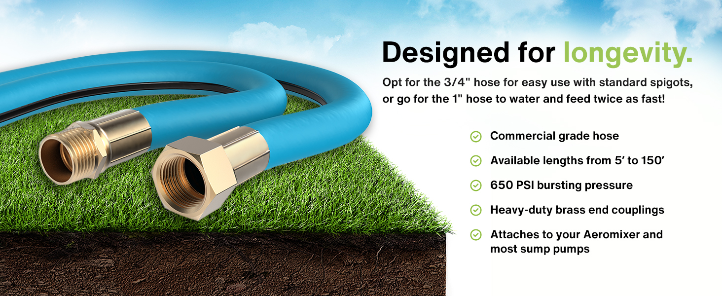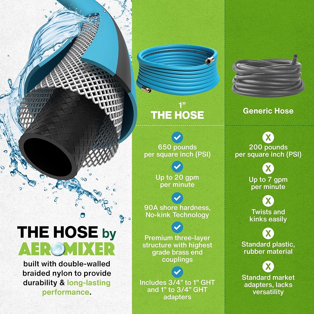 VERSATILE COMPATIBILITY: The Aeromixer 100 ft garden hose is highly compatible with sump pumps and includes adapters to easily connect to standard 3/4" spigots. Whether you need a 100 ft water hose for outside applications or are looking for a heavy-duty garden hose for industrial use, our fire hose meets various needs. Its flexibility makes it the ideal 100 ft garden hoses for both commercial water hose applications and home gardening, providing convenience and reliability in every use.