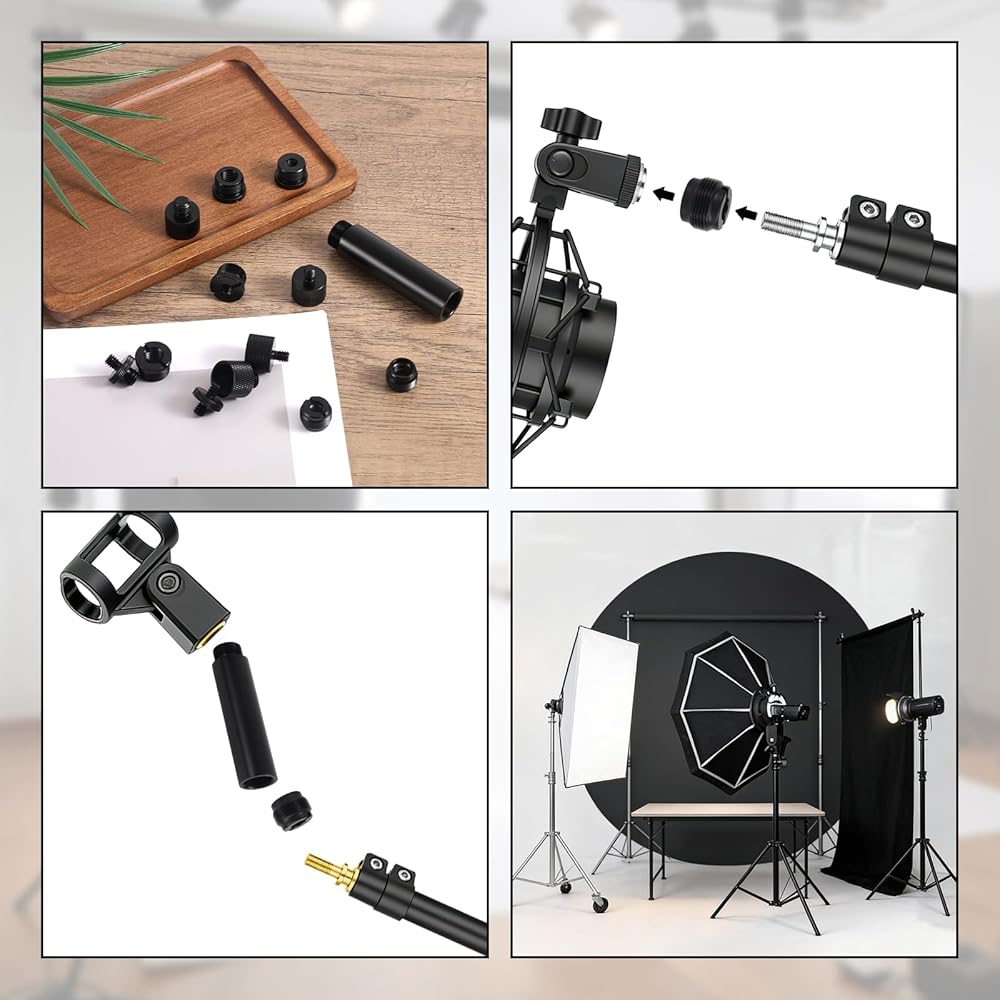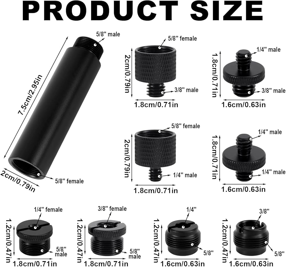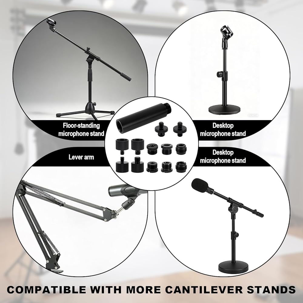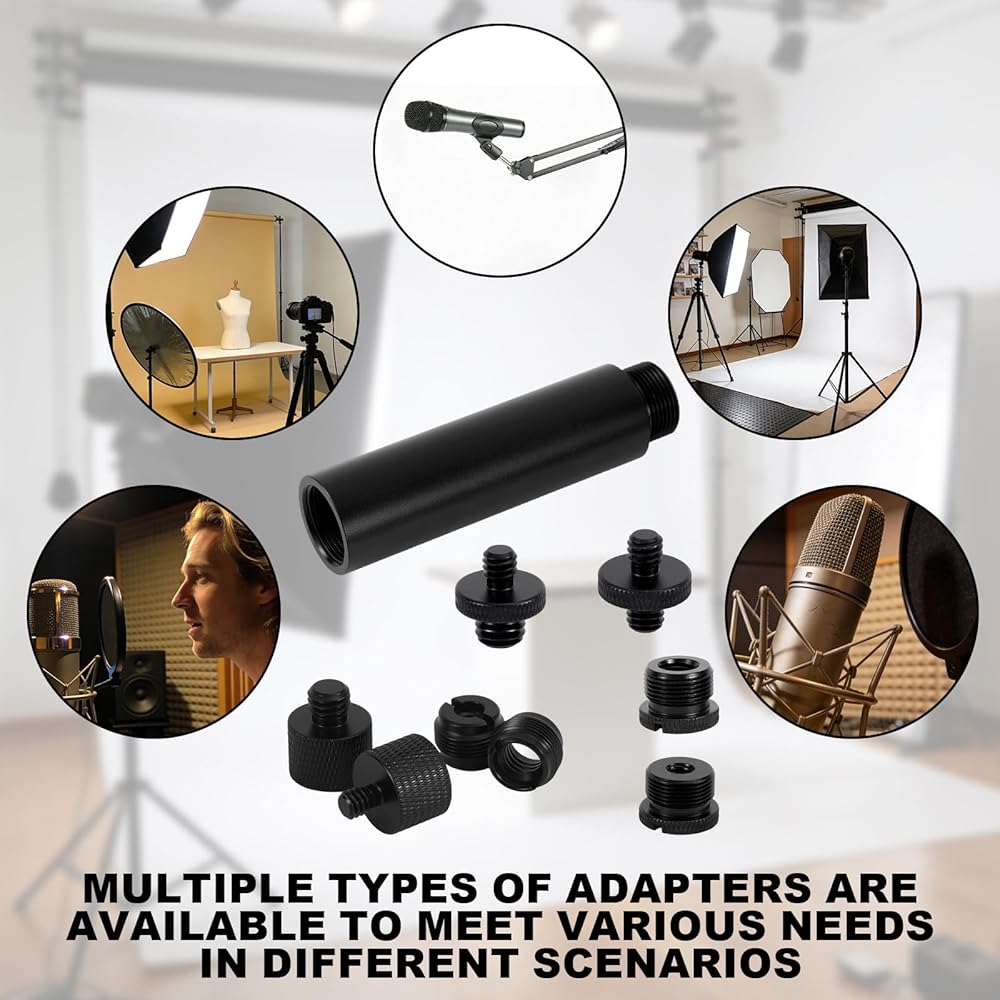 Product List: Includes 12 microphone stand adapters with extension tube for 3/8" to 5/8" and 1/4" thread conversions. Perfect solution for audio engineers, photographers, and content creators needing flexible mounting options.