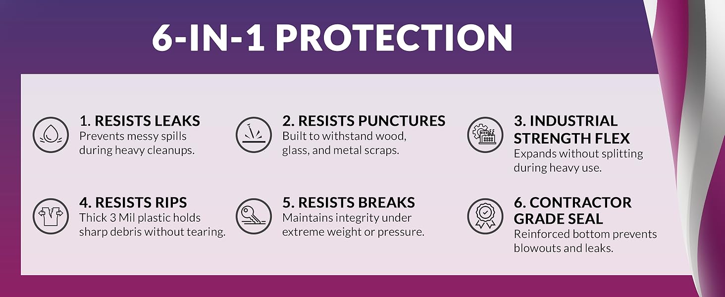 𝐏𝐮𝐧𝐜𝐭𝐮𝐫𝐞 & 𝐋𝐞𝐚𝐤 𝐑𝐞𝐬𝐢𝐬𝐭𝐚𝐧𝐭: Designed for strength, these large trash bags 55 gallon heavy duty handle bulky or sharp items with ease. Use as contractor bags, lawn and leaf bags, or yard waste bags without worrying about leaks, rips, or tears during major cleanup jobs indoors or outdoors.