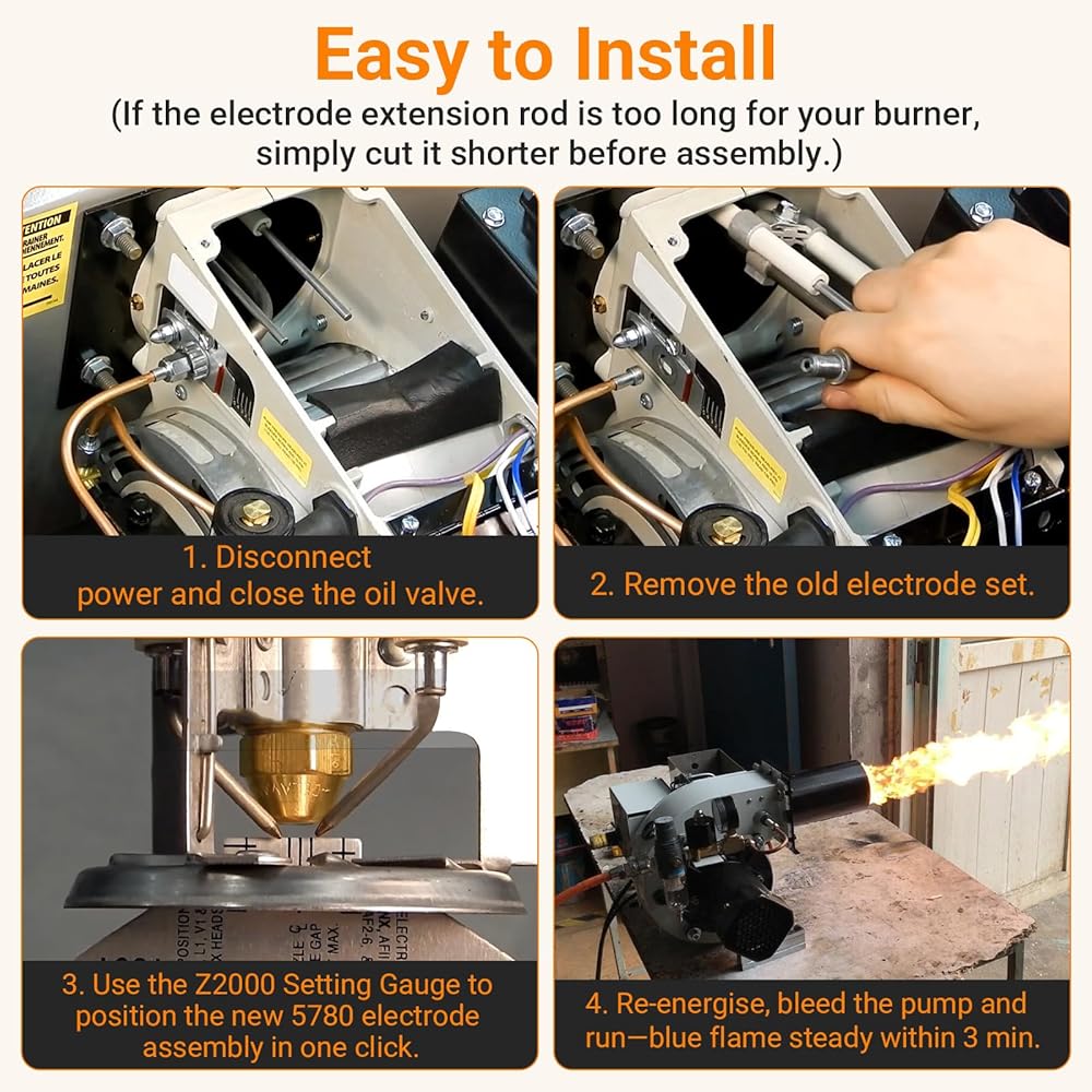 【Easy to Install】After disconnecting the power and draining the oil, remove the old assembly → use the Z2000 setting gauge to position the new 5780 electrode insulator gap in one step → installation is complete. (If the electrode extension rod is too long for the burner, simply cut it to the required length.)