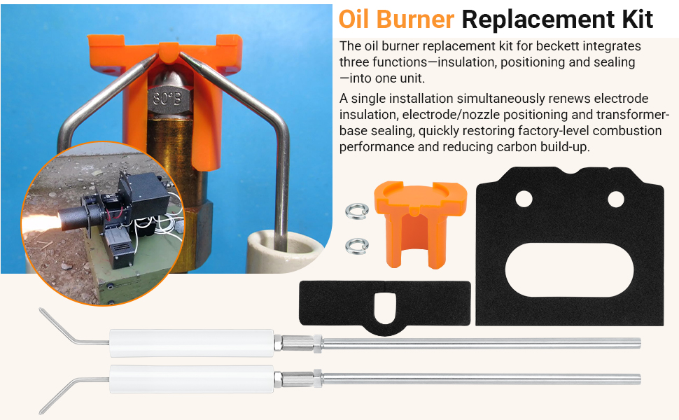 【Oil Burner Replacement Kit】The oil burner replacement kit for Beckett integrates three functions—insulation, positioning and sealing—into one unit. A single installation simultaneously renews electrode insulation, electrode/nozzle positioning and transformer-base sealing, quickly restoring factory-level combustion performance and reducing carbon build-up.