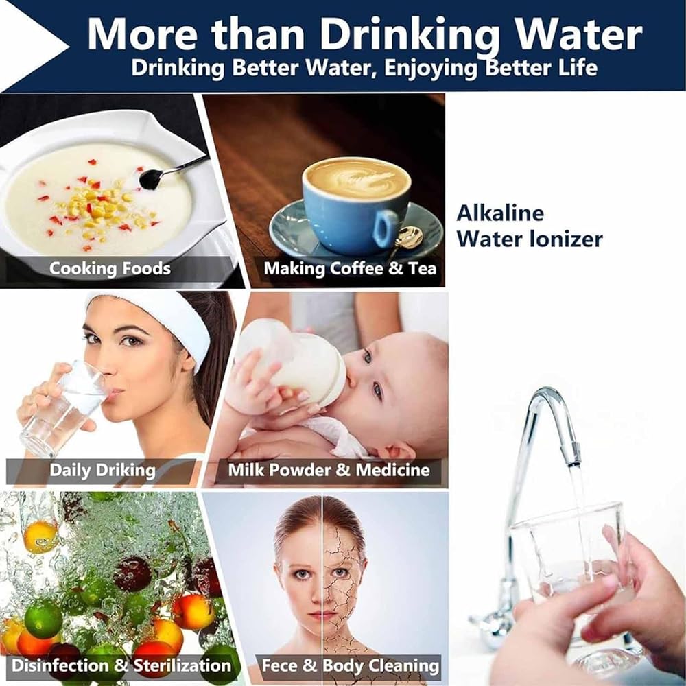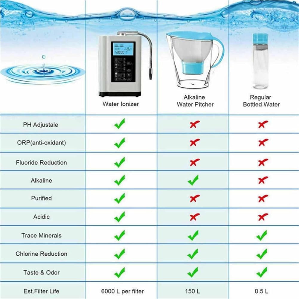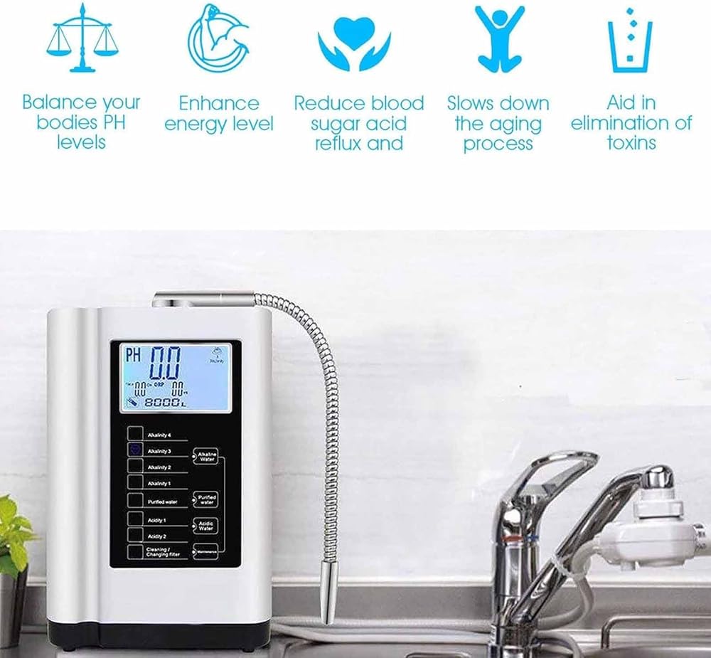 Display content: alkaline, acid, water purification, cleaning, filter life, flow, temperature, time, water production dynamics, pH, orp, electrolysis display, D-section electrolysis