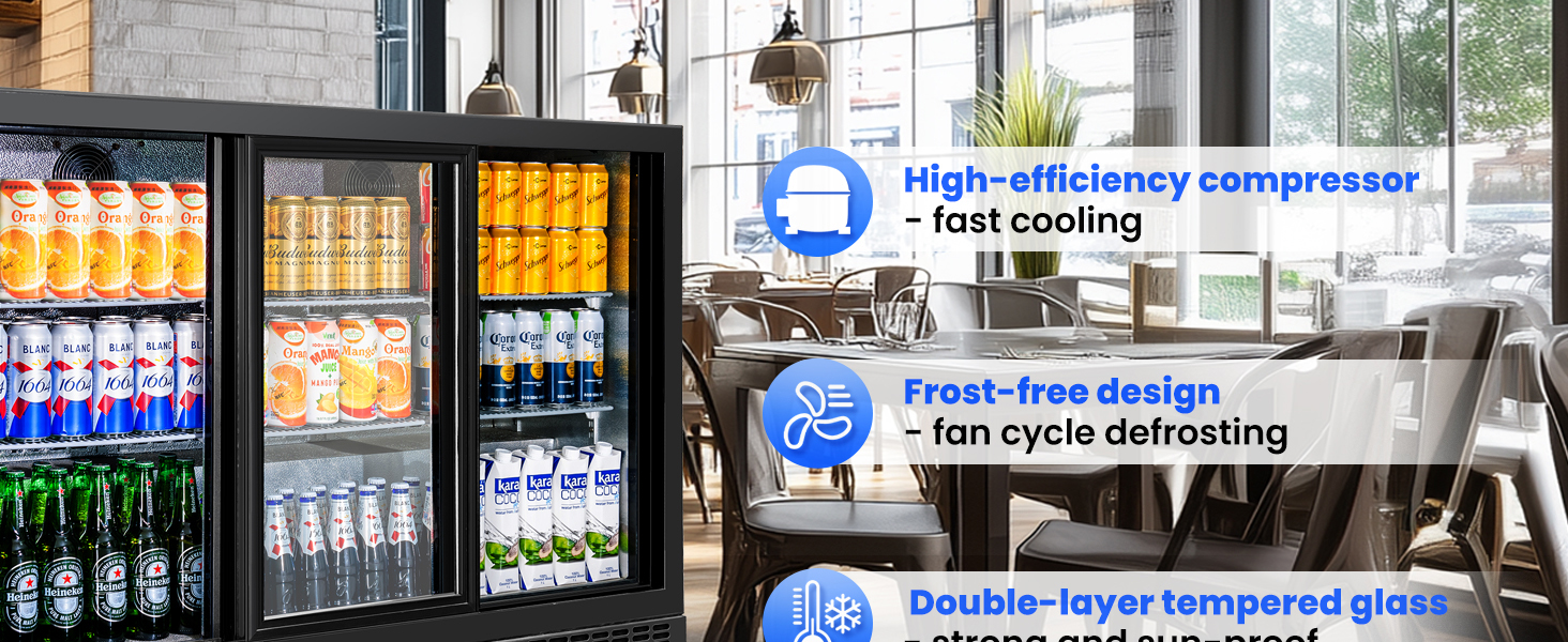 Premium Features: Our commercial beverage fridges feature durable double-layer tempered LOW-E glass doors that block sunlight while maintaining temperature. Drink fridge details include: energy-saving LED interior lighting, digital temperature display, security lock, magnetic door seal