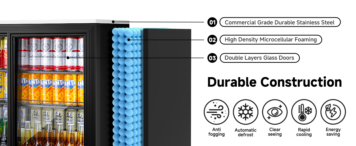 🛠️【Durable Construction & Commercial-Grade Materials】Built to last, this bar cooler fridge features embossed aluminum interior walls that resist skids and corrosion while providing thermal insulation. The interior is complemented by a silver-coated steel exterior that offers reliable corrosion resistance and a clean, professional look. Every detail is designed with durability in mind—so your investment stays looking and performing like new for years to come.