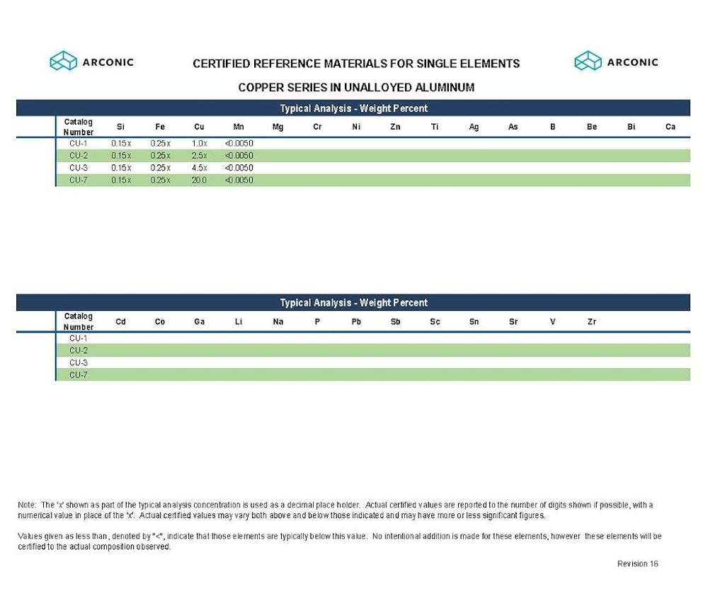 Arconic Spectrochemical Reference Materials, located at the Arconic Technology Center near Pittsburgh, Pennsylvania has been producing certified reference materials (CRMs) and reference materials (RMs) for the aluminum industry for more than 70 years. Our CRMs are widely recognized for their uniformity and accuracy of certification. Arconic CRMs and RMs are typically used for calibration, drift correction, quality assurance, and method validation for Spark-AES instrumentation used by the aluminum industry to verify the composition of aluminum and aluminum alloys. We maintain a large inventory of CRMs and RMs consisting of more than 300 alloy compositions targeted to meet the needs of the aluminum industry. Arconic Spectrochemical Reference Materials holds accreditations for the following ISO standards: Guide 34:2009, 17025:2005, and 9001:2008. Arconic produces single element CRMs with varied levels of individual elements in unalloyed aluminum and various alloy matrices such as high silicon. The single element CRMs are available in a series for each element with various concentrations. They are useful when extending existing calibration curves as well as making adjustments to curves when alloy specific SS CRMs are not adequate. Single element CRMs are designated with a two-letter identifier that corresponds with the chemical abbreviation for the element added.