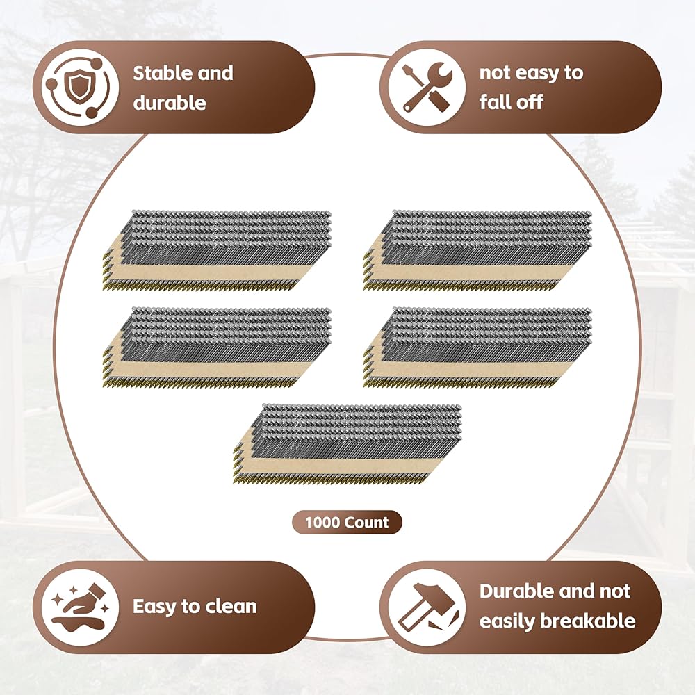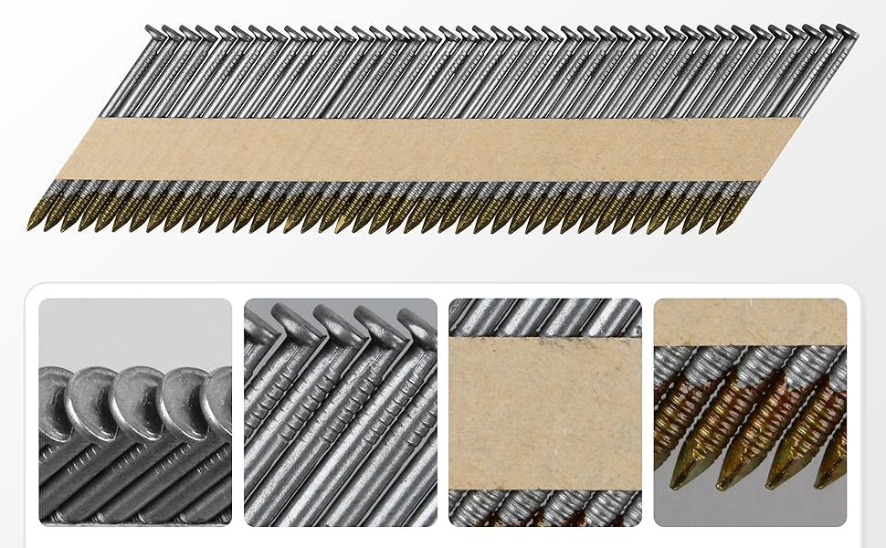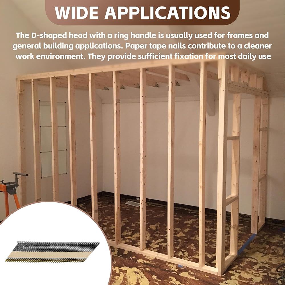 Fit for 33° Pneumatic Framing Nailers:Designed exclusively for 33 Degree Pneumatic Framing Nailers, these Paper Tape Strip Nails feature neat alignment to prevent jamming. The 2-inch standard length works great for basic woodworking tasks, easy to handle for both pros and beginners