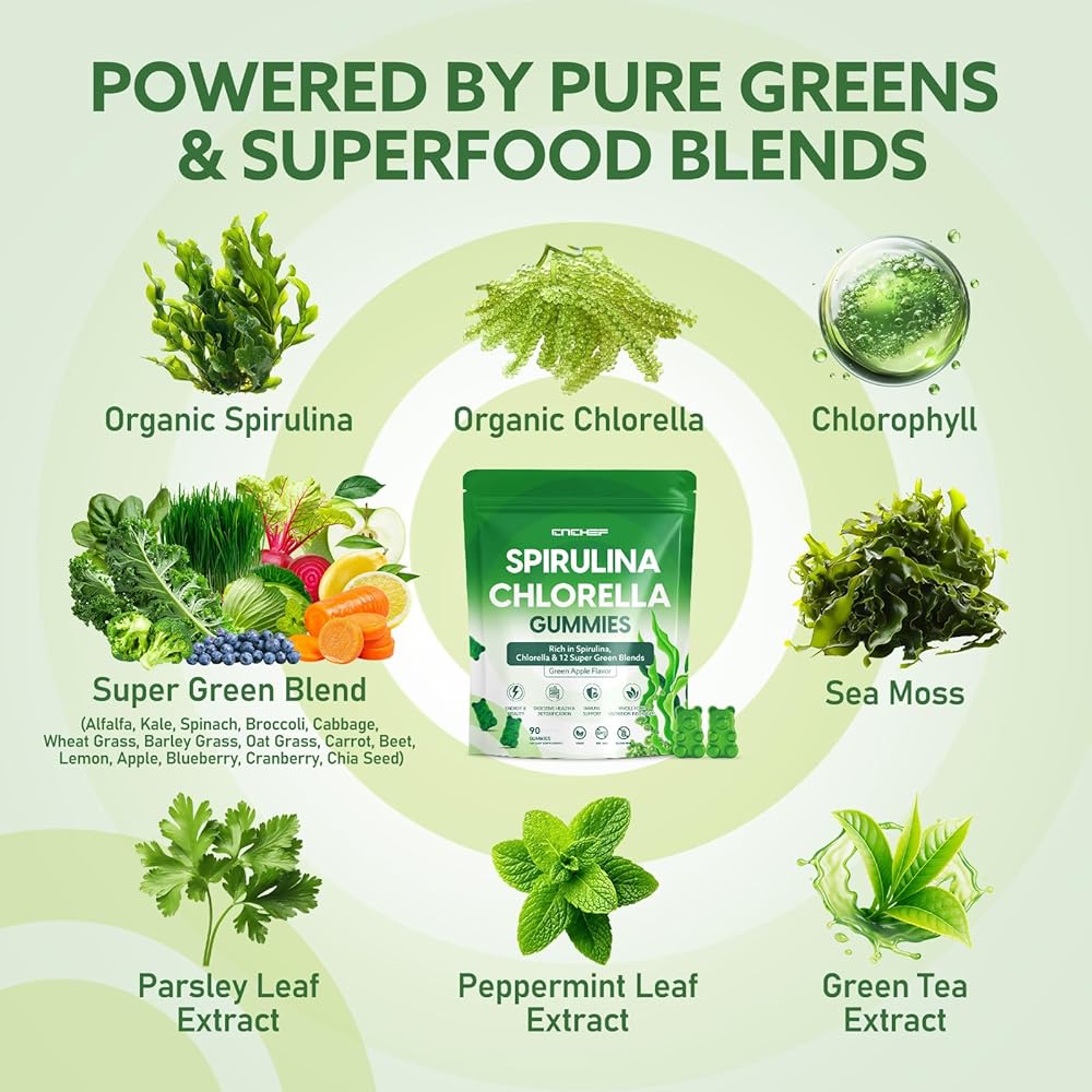 Organic Spirulina & Chlorella Gummies with 12 Super Greens Blend, Chlorophyll, Sea Moss, Parsley Leaf, Peppermint Leaf and Green Tea for Daily Energy, Detox & Immunity, 90-Count, Green Apple Flavor