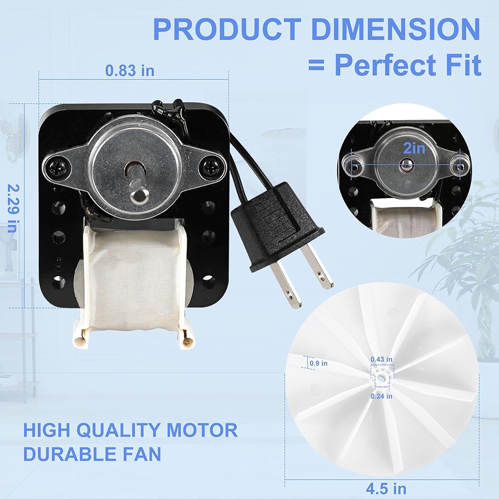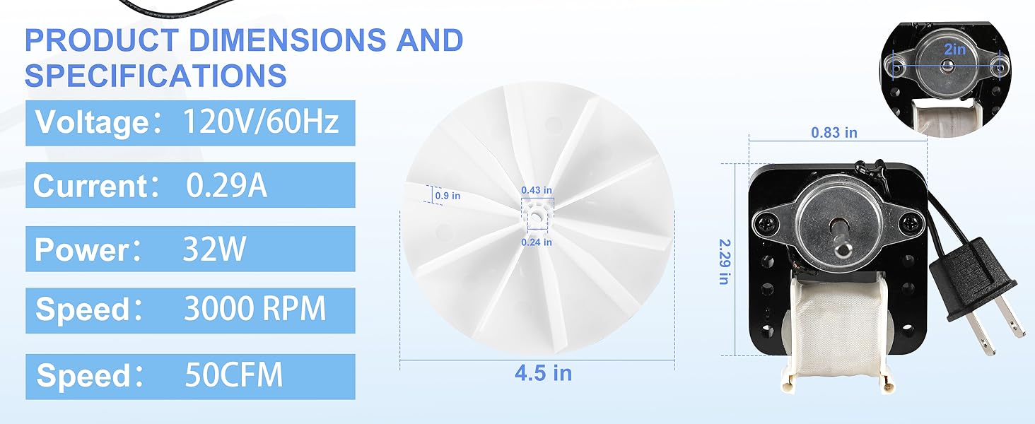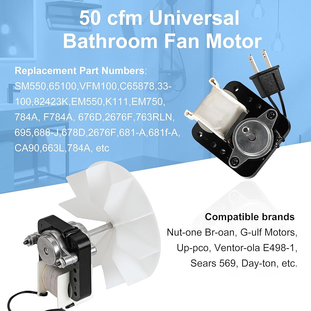 PRODUCT SPECIFICATIONS: Compatible for Nutone Broan bathroom exhaust fan replacement 50CFM, 0.65 Amp, 3000 RPM, 120 Volt, 60 Hz. Precision-Balanced 5/8 Coil Pack and Aerodynamic Blade, Shaft = 1.75" long x 3/16" diameter, wire length = 6" with 2-prong plug bathroom exhaust fan replacement have passed UL certified, stable and durable