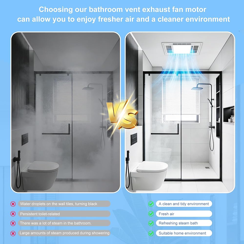 HIGH-EFFICIENCY AIR CIRCULATION: replacement bathroom exhaust fan A 3000RPM high-speed motor provides a continuous and powerful suction; fan motor a 0.6A high-current drive ensures ventilation efficiency far exceeding that of ordinary low-power motors. It's not limited to localized exhaust; bathroom fan motor powerful airflow effectively promotes air convection throughout the entire bathroom space