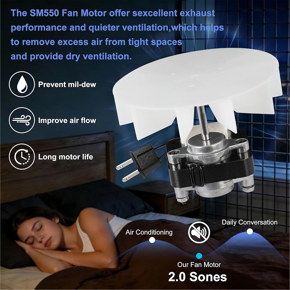 Bathroom Vent Exhaust Fan Motor Replacement Electric Motors Kit, Compatible for Nutone Broan Uppco Quiet Exhaust Vent Fan Motor 50CFM 3000RPM 120V, 1.5 Sones SM550 with Blower Wheel