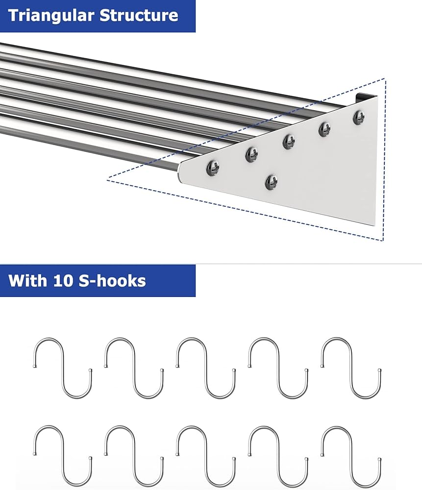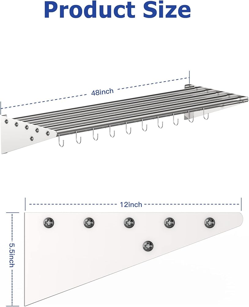 EcoExplorer Stainless Steel Shelf Wall Mounted, NSF Commercial Wall Shelf, Floating Shelving for Kitchen, Restaurant, Home, Hotel, 48 x 12 Inches Pipe Surface with 10 Hooks