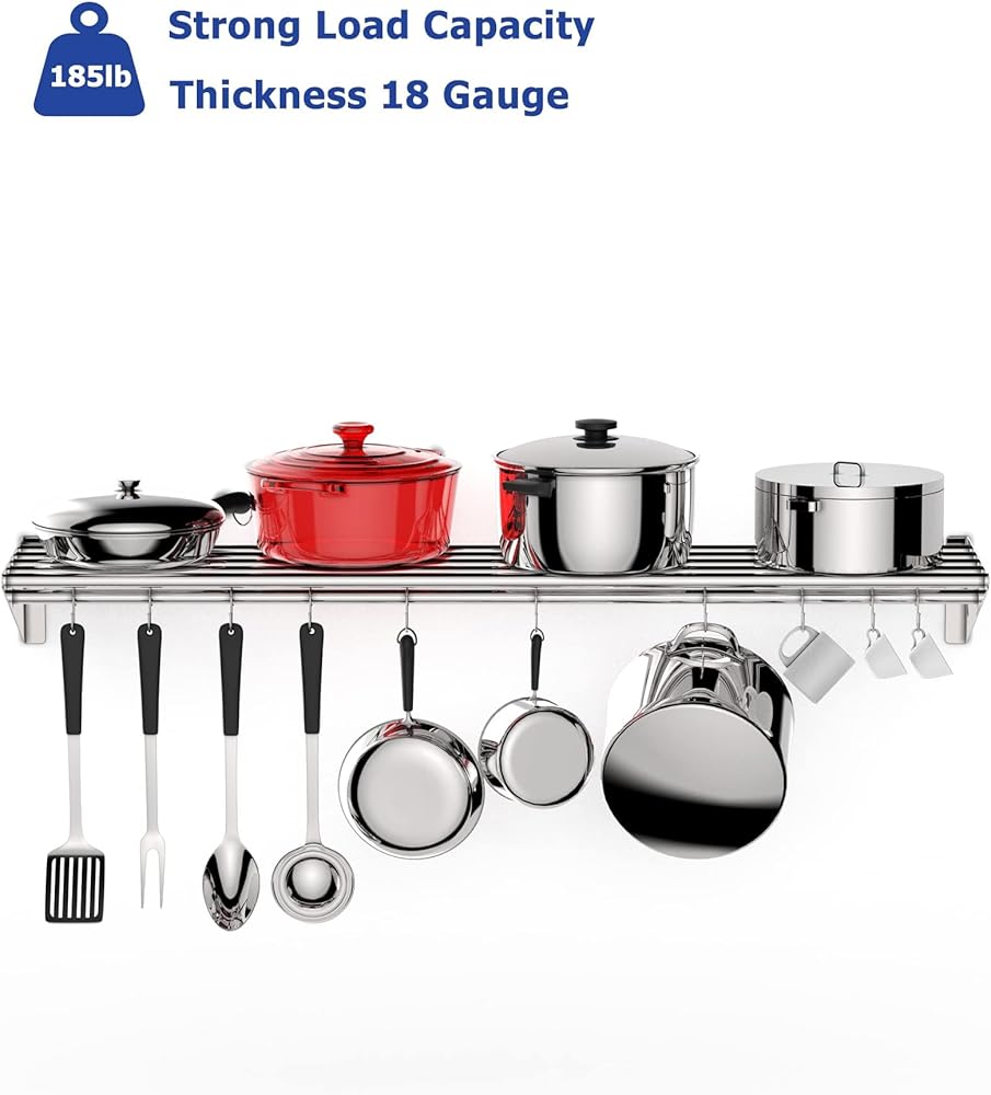 [DURABLE SUPPORT] - The EcoExplorer stainless steel shelf can hold up to 185 lbs and measures 12"D x 48"L x 6"H, offering an ideal solution for organizing kitchen appliances, condiments, and more while efficiently utilizing wall space