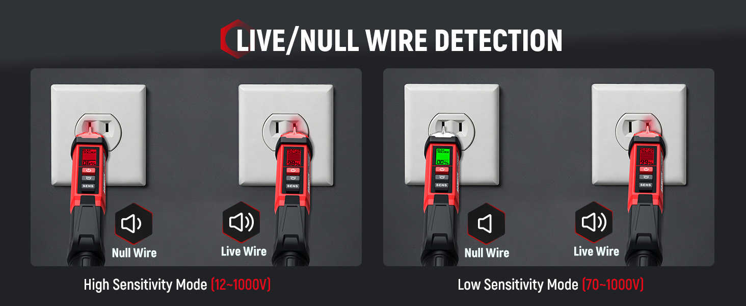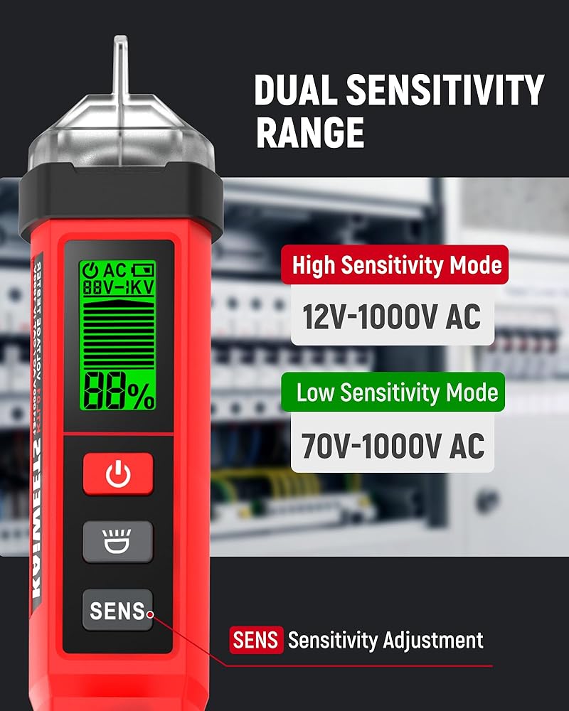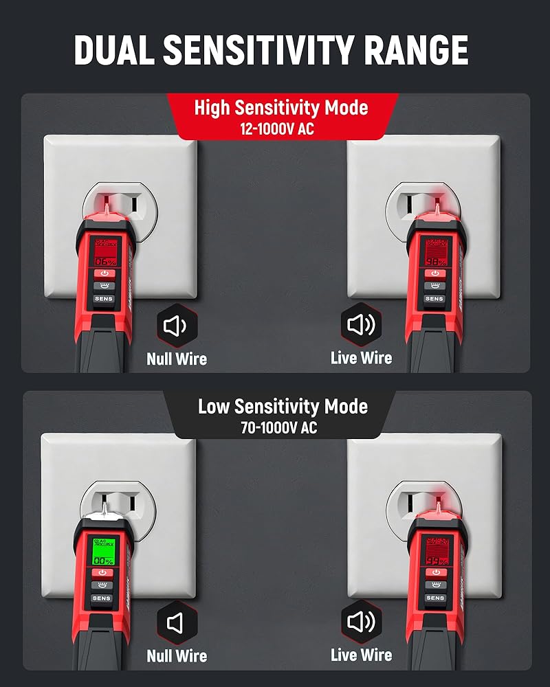 【Dual-Range Voltage Sensitivity】Supports 12–1000V AC high range and 70–1000V AC low range. Easily switch ranges with the SENS button. The high range is ideal for household wiring, outlets, and breakers, while the low range suits sensitive devices like doorbells, thermostats, and irrigation systems, helping reduce false alarms and interference for home and professional use.