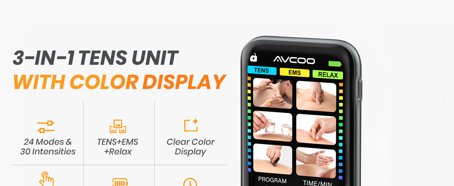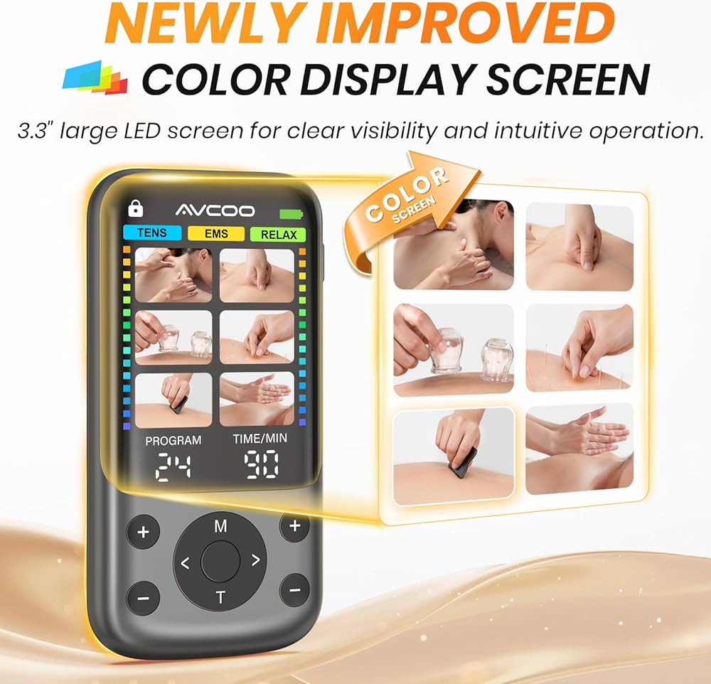 A Drug-Free Way to Relieve Your Pain: The AVCOO 3-in-1 TENS machine combines three powerful therapies—TENS, EMS, and MASSAGE—into one compact device. TENS modes use mild electrical pulses to stimulate sensory nerves, helping block pain signals for pain relief in the back, shoulders, neck, waist, arms, and legs. Its EMS modes target motor nerves to improve muscle performance, while massage modes provide gentle, massage-like pulses to ease tension