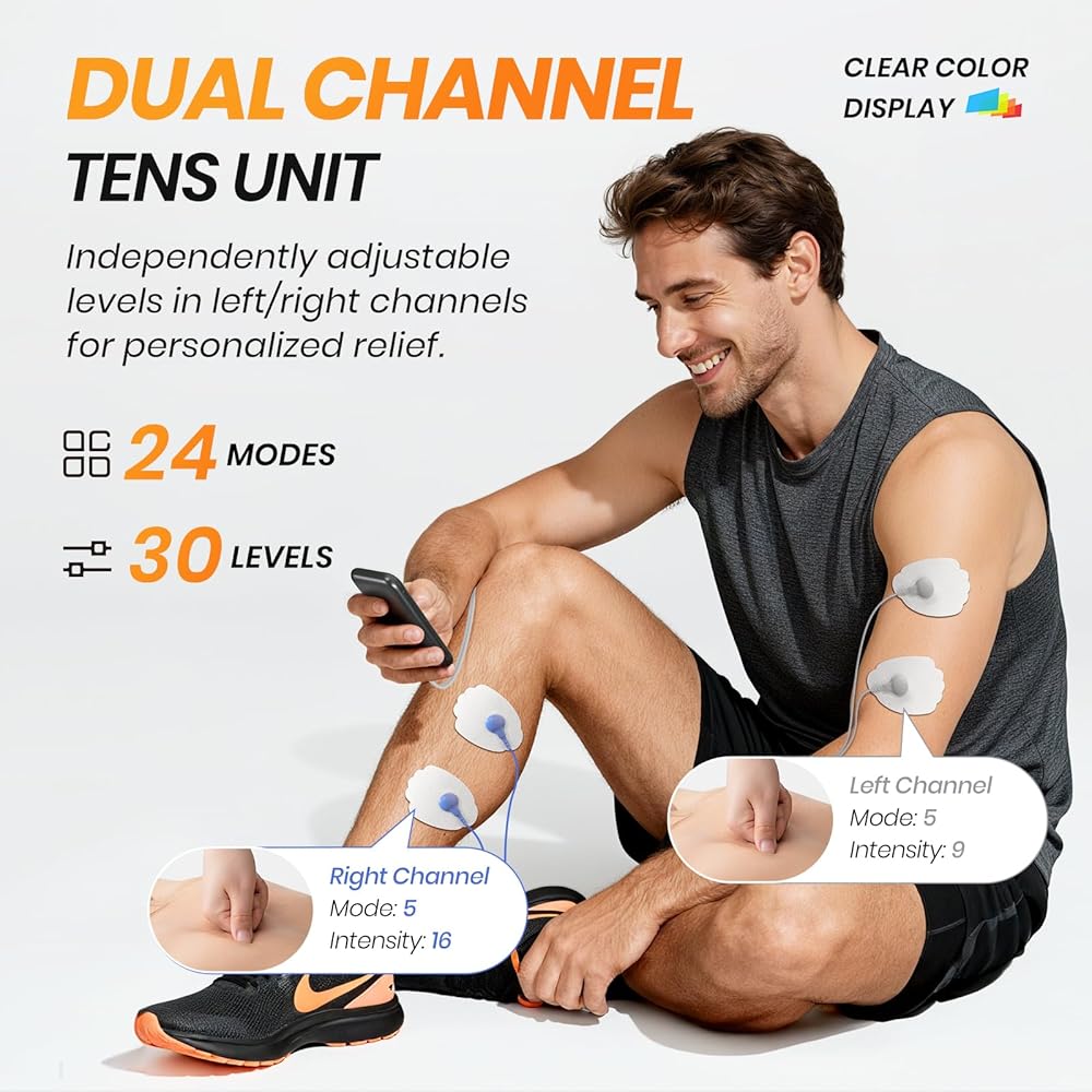 24 Modes and 30 Levels: Featuring 24 modes and 30 intensity levels, this TENS unit for pain relief offers personalized therapy. The independent intensity level control for dual channels allows you to customize treatment for multiple body areas simultaneously, effectively relieving pain in the elbows, shoulders, back, waist, and legs