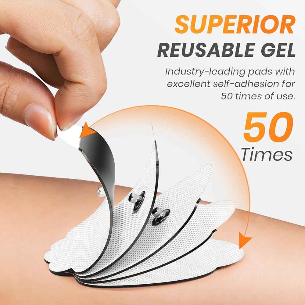 Premium Multi-Shaped Pads: The AVCOO TENS pads come in three shapes to suit different treatment areas: palm-shaped pads for the back, arms, waist, and thighs; rectangular pads for large areas like the waist and thighs; and oval pads for smaller areas like the wrist and the web of the thumb. All pads are made from latex-free gel that has strong adhesion for up to 50 uses. They are skin-friendly, easy to peel off, and leave no gel residue, ensuring a comfortable therapy experience every time