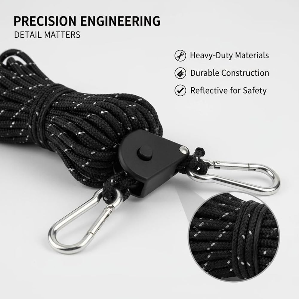 What You'll Get: You'll receive a set of four premium tent rope ratchet adjusters, each featuring a durable black shell and a 16' black reflective rope with a 1/4” diameter. Perfect for securing tents, kayaks, or outdoor gear, this kit includes all hardware for quick tie down straps applications.