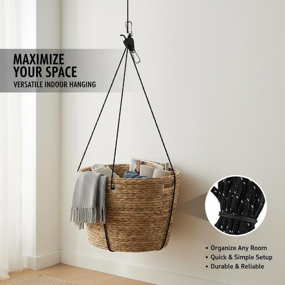 4 Pack Adjustable Rope Ratchet Pulley with Carabiners, Heavy Duty Tie Down Straps for Secure Camping, Kayak, Tents and Tarps (1/4" Rope Diameter, 16’ Length, Black)