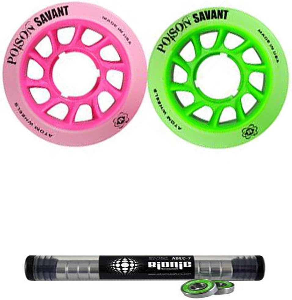 Love Poison grip but want more roll?... Say hello to Poison Savant! What could possibly make Atom's Poison, one of the top performing wheels in the industry, any better?... Our exciting NEW SAVANT core of course! First, we start with Savant, featuring an oversized core with a molded lip. The oversized core not only reduces weight but increases the overall roll (speed). With the increased speed the molded lip plays a big role in ensuring the grip characteristics remain. Then we wrapped that puppy in our famous Poison urethane. Poison provides awesome grip without that 'sluggish marshmallow' feeling which allows for more roll. Poison Savant is perfect for outdoor tracks, slick sport courts, bank tracks and dirty wood floors.