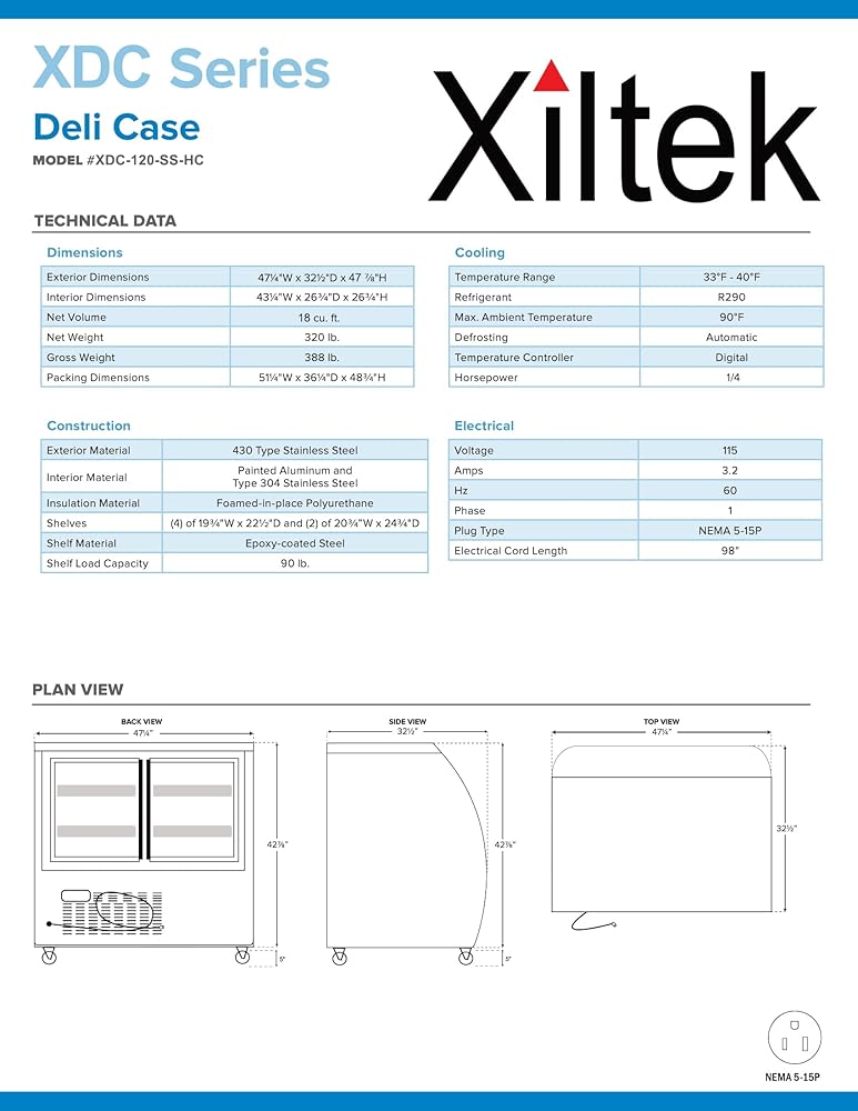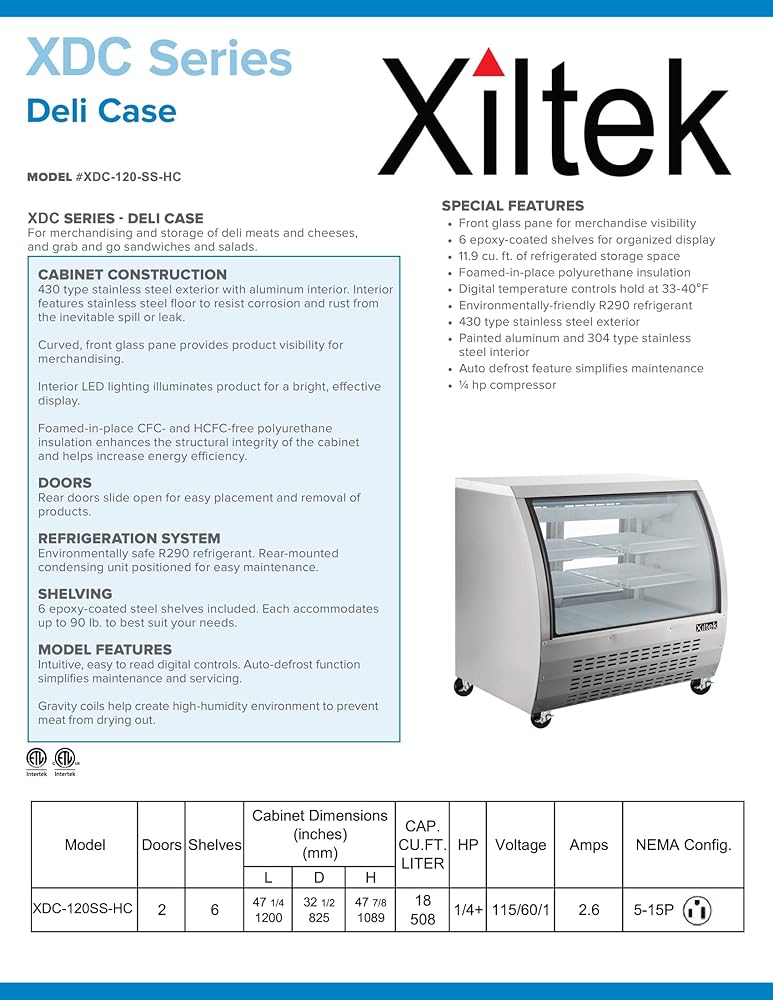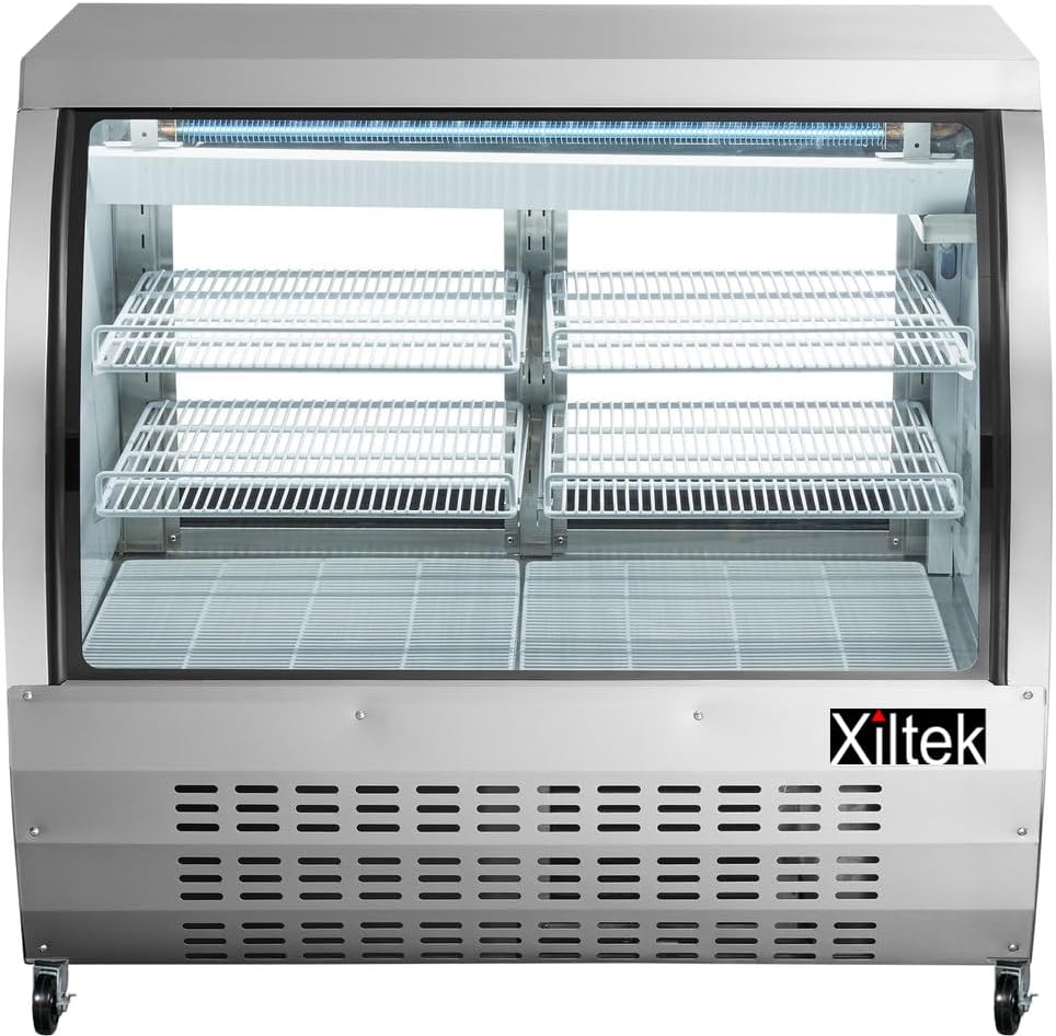 Elevate your food service presentation with the Xiltek 48-inch Deli Case. This commercial refrigeration unit provides ample display space with its generous 48-inch width, making it perfect for showcasing deli meats, cheeses, prepared foods, and other perishable items. The refrigerated display case maintains optimal temperature to keep your products fresh while allowing customers clear visibility of the merchandise. Ideal for delis, cafeterias, convenience stores, and food service establishments seeking professional-grade refrigeration solutions.