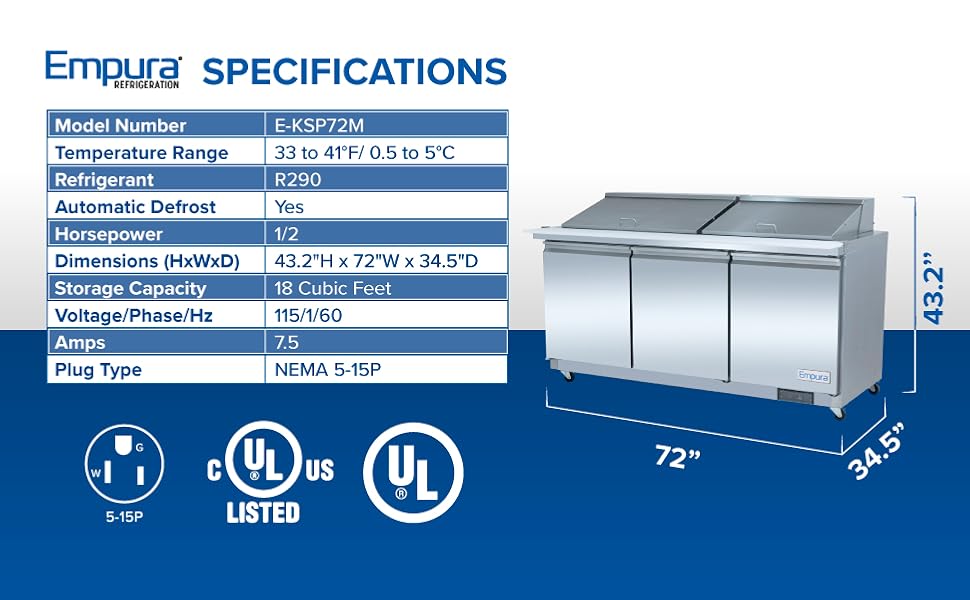 EFFICIENT INGREDIENT ORGANIZATION WITH ADJUSTABLE SHELVING: The Empura E-KSP72M includes heavy-duty, epoxy-coated wire shelves that can be adjusted to accommodate a variety of storage needs. Each door is equipped with one adjustable shelf, allowing for customized organization of ingredients and supplies. The epoxy coating adds a layer of protection against corrosion, ensuring that the shelves remain durable and easy to clean over time.