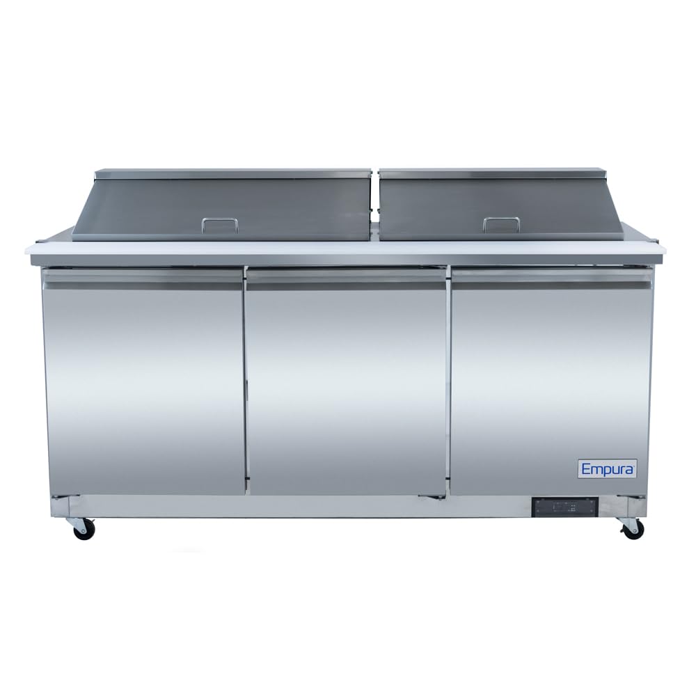 Empura 72" Mega Top Refrigerated Prep Table with Three-Solid Door | Sandwich Salad Preparation Fridge with (27) 1/6" Pans and 9" Cutting Board | 71.7"W x 34.5"D x 43.2"H, Stainless Steel, 115v, NSF