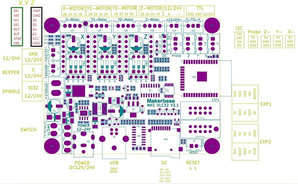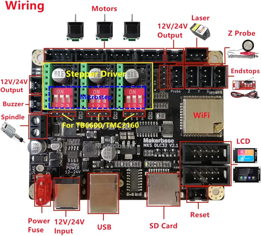 MKS DLC32 is a 32-bit high speed control board for desktop cnc laser engraving machine.In-built WIFI chip and support Web/APP control.Directly drives MKS TS2.4 inches touch screen.