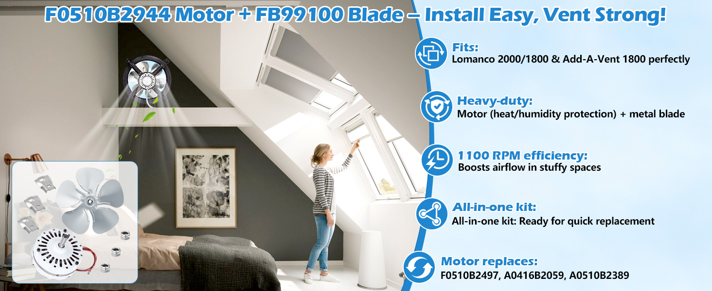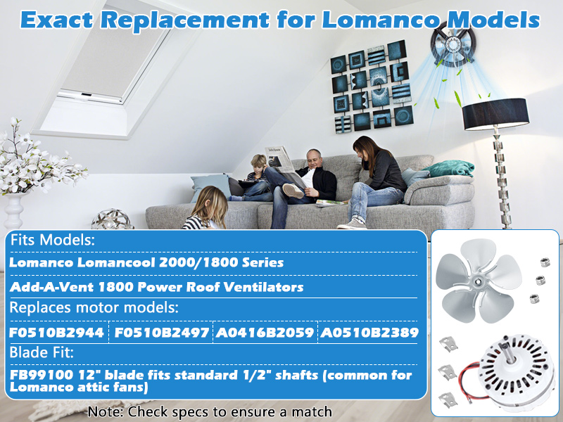 • Wide Compatibility:This combo set (F0510B2944 motor + FB99100 blade) fits Lomanco 2000/1800 Series & Add-A-Vent 1800 Power Roof Ventilators. Motor replaces F0510B2497/A0416B2059/A0510B2389; 12" blade fits 1/2" shafts—no full-system swap needed.