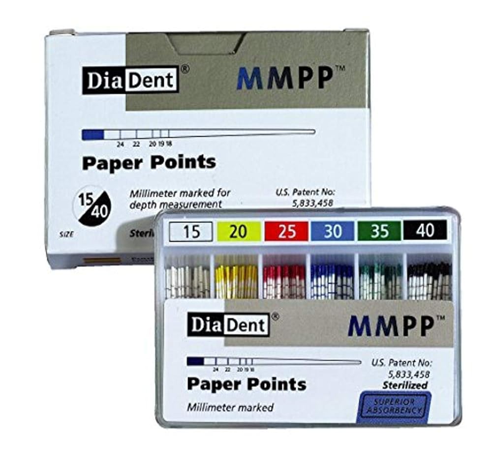 DiaDent colour coded paper points are made from specially formulated, highly absorbent paper. Each of the paper point is individually hand jig rolled to ensure perfect size and firmness. DiaDent paper points have been awarded the ISO 9001 and CE Certification insuring, a high standard of design, manufacturing and quality assurance. Paper points are available in either pre-sterilized cell packs (5 points per cell, 40 cells per Pack), vials (6 vials per package, 200 points per box) or spillproof packaging (200 points per box).